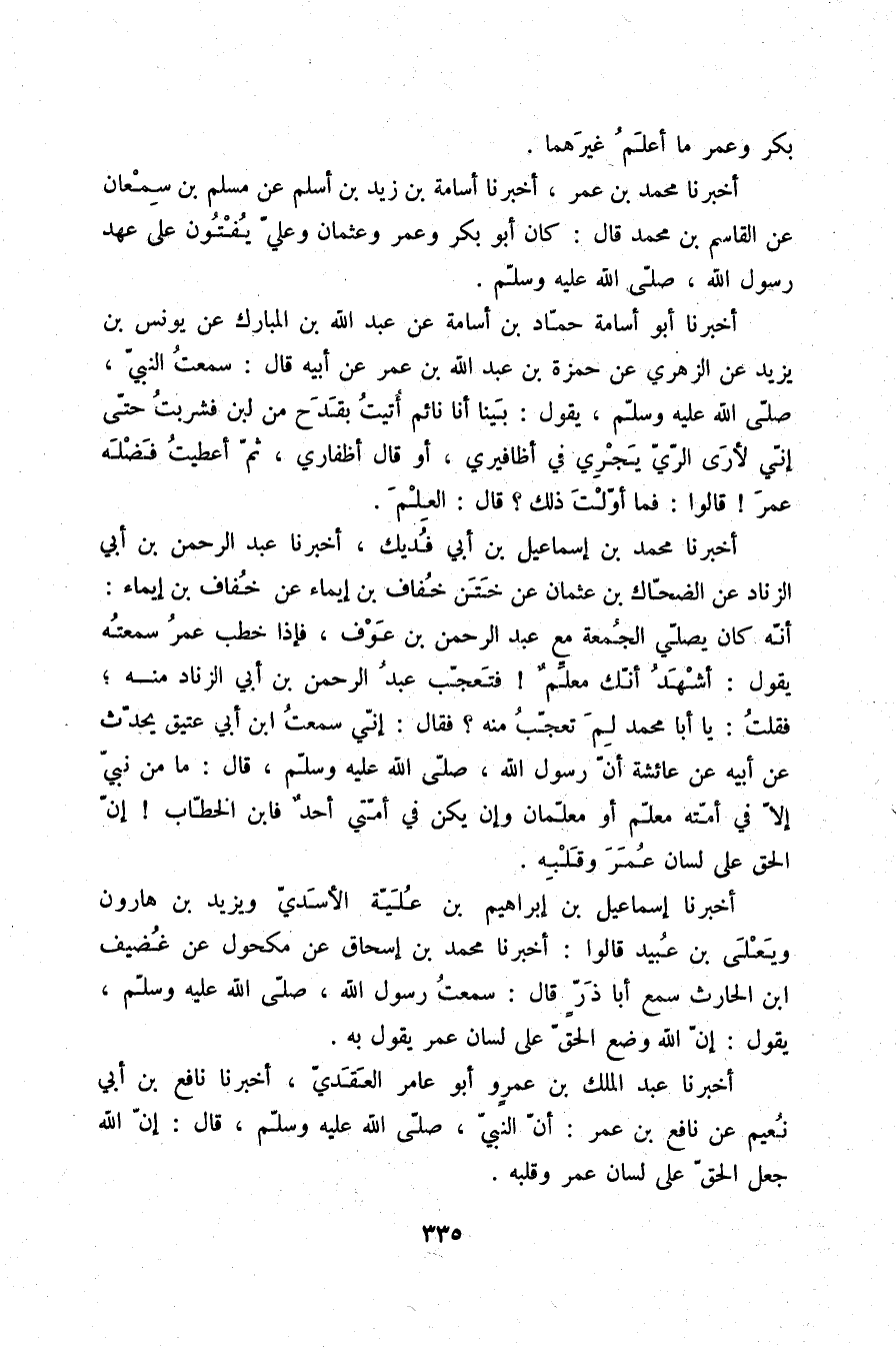 أَخْبَرَنَا أَبُو أُسَامَةَ حَمَّادُ بْنُ أُسَامَةَ، عَنْ عَبْدِ اللَّهِ بْنِ الْمُبَارَكِ، عَنْ يُونُسَ بْنِ يَزِيدَ، عَنِ الزُّهْرِيِّ، عَنْ حَمْزَةَ بْنِ عَبْدِ اللَّهِ بْنِ عُمَرَ، عَنْ أَبِيهِ، قَالَ: سَمِعْتُ النَّبِيَّ صلّى الله عليه وسلم يَقُولُ: «بَيْنَا أَنَا نَائِمٌ §أُتِيتُ بِقَدَحٍ مِنْ لَبَنٍ فَشَرِبْتُ حَتَّى إِنِّي لَأَرَى الرِّيَّ يَجْرِي فِي أَظَافِيرِي» ، أَوْ قَالَ: «أَظْفَارِي، ثُمَّ أَعْطَيْتُ فَضْلَهُ عُمَرَ» ، قَالُوا: فَمَا أَوَّلْتَ ذَلِكَ؟، قَالَ: «الْعِلْمَ»