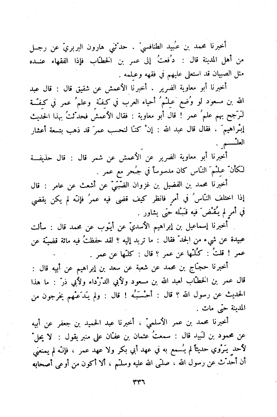 أَخْبَرَنَا أَبُو مُعَاوِيَةَ الضَّرِيرُ، أَخْبَرَنَا الْأَعْمَشُ، عَنْ شَقِيقٍ، قَالَ: قَالَ عَبْدُ اللَّهِ بْنُ مَسْعُودٍ: «§لَوْ وُضِعَ عِلْمُ أَحْيَاءِ الْعَرَبِ فِي كِفَّةٍ وَعِلْمُ عُمَرَ فِي كِفَّةٍ لَرَجَحَ بِهِمْ عِلْمُ عُمَرَ» قَالَ أَبُو مُعَاوِيَةَ: فَقَالَ الْأَعْمَشُ: فَحَدَّثْتُ بِهَذَا الْحَدِيثِ إِبْرَاهِيمَ فَقَالَ: قَالَ عَبْدُ اللَّهِ: إِنْ كُنَّا لَنَحْسِبُ عُمَرَ قَدْ ذَهَبَ بِتِسْعَةِ أَعْشَارِ الْعِلْمِ "
