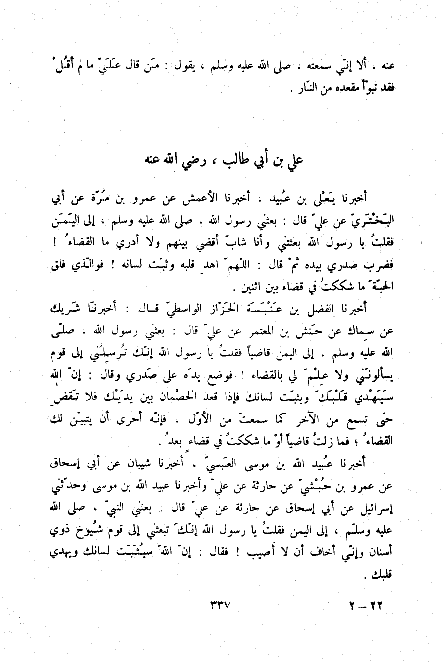 أَخْبَرَنَا الْفَضْلُ بْنُ عَنْبَسَةَ الْخَزَّازُ الْوَاسِطِيُّ، قَالَ: أَخْبَرَنَا شَرِيكٌ، عَنْ سِمَاكٍ، عَنْ حَنَشِ بْنِ الْمُعْتَمِرِ، عَنْ عَلِيٍّ، قَالَ: " بَعَثَنِي رَسُولُ اللَّهِ صلّى الله عليه وسلم إِلَى الْيَمَنِ قَاضِيًا فَقُلْتُ: يَا رَسُولَ اللَّهِ، إِنَّكَ تُرْسِلُنِي إِلَى قَوْمٍ يَسْأَلُونَنِي وَلَا عِلْمَ لِي بِالْقَضَاءِ فَوَضَعَ يَدَهُ عَلَى صَدْرِي وَقَالَ: «§إِنَّ اللَّهَ سَيَهْدِي قَلْبَكَ، وَيُثَبِّتُ لِسَانَكَ، فَإِذَا قَعَدَ الْخَصْمَانِ بَيْنَ يَدَيْكَ فَلَا تَقْضِ حَتَّى تَسْمَعَ مِنَ الْآخَرِ كَمَا سَمِعْتَ مِنَ الْأَوَّلِ، فَإِنَّهُ أَحْرَى أَنْ يَتَبَيَّنَ لَكَ الْقَضَاءُ» ، فَمَا زِلْتُ قَاضِيًا أَوْ مَا شَكَكْتُ فِي قَضَاءٍ بَعْدُ "