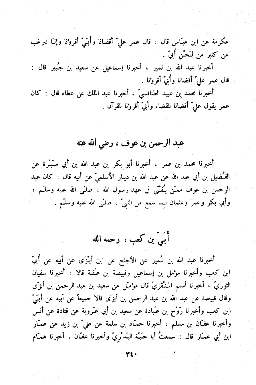 أَخْبَرَنَا عَبْدُ اللَّهِ بْنُ نُمَيْرٍ، أَخْبَرَنَا إِسْمَاعِيلُ، عَنْ سَعِيدِ بْنِ جُبَيْرٍ، قَالَ: قَالَ عُمَرُ: «§عَلِيُّ أَقْضَانَا، وَأُبَيُّ أَقْرَؤُنَا»
