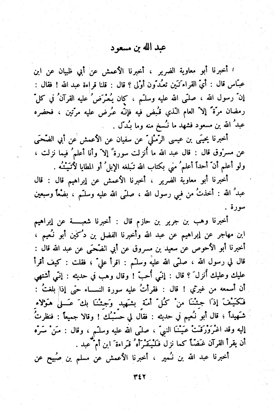أَخْبَرَنَا أَبُو مُعَاوِيَةَ الضَّرِيرُ، أَخْبَرَنَا الْأَعْمَشُ، عَنْ إِبْرَاهِيمَ، قَالَ: قَالَ عَبْدُ اللَّهِ: «§أَخَذْتُ مِنْ فِي رَسُولِ اللَّهِ صلّى الله عليه وسلم بِضْعًا وَسَبْعِينَ سُورَةً»