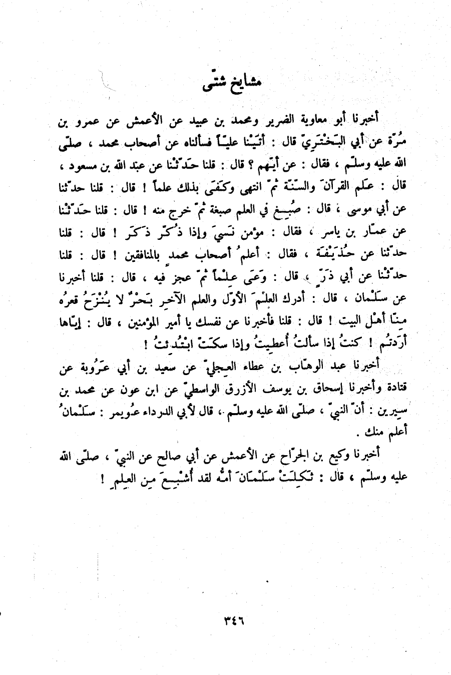 أَخْبَرَنَا وَكِيعُ بْنُ الْجَرَّاحِ، عَنِ الْأَعْمَشِ، عَنْ أَبِي صَالِحٍ، عَنِ النَّبِيِّ صلّى الله عليه وسلم، قَالَ: «§ثَكِلَتْ سَلْمَانَ أُمُّهُ، لَقَدْ أُشْبِعَ مِنَ الْعِلْمِ»