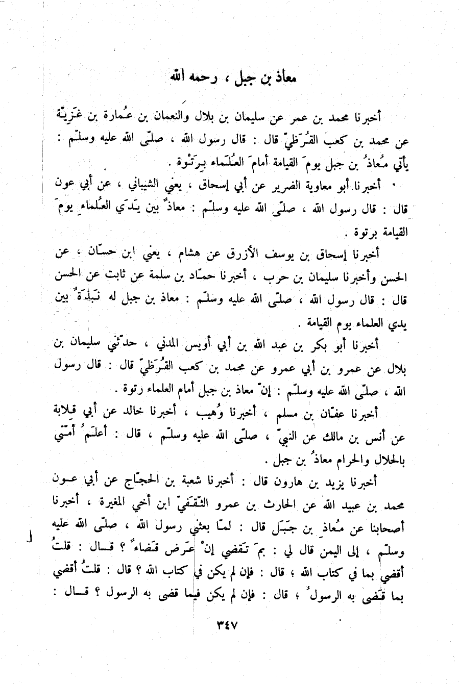 أَخْبَرَنَا إِسْحَاقُ بْنُ يُوسُفَ الْأَزْرَقُ، عَنْ هِشَامٍ يَعْنِي ابْنَ حَسَّانَ، عَنِ الْحَسَنِ، وَأَخْبَرَنَا سُلَيْمَانُ بْنُ حَرْبٍ، أَخْبَرَنَا حَمَّادُ بْنُ سَلَمَةَ، عَنْ ثَابِتٍ، عَنِ الْحَسَنِ، قَالَ: قَالَ رَسُولُ اللَّهِ صلّى الله عليه وسلم: «§مُعَاذُ بْنُ جَبَلٍ لَهُ نَبْذَةٌ بَيْنَ يَدَيِ الْعُلَمَاءِ يَوْمَ الْقِيَامَةِ»