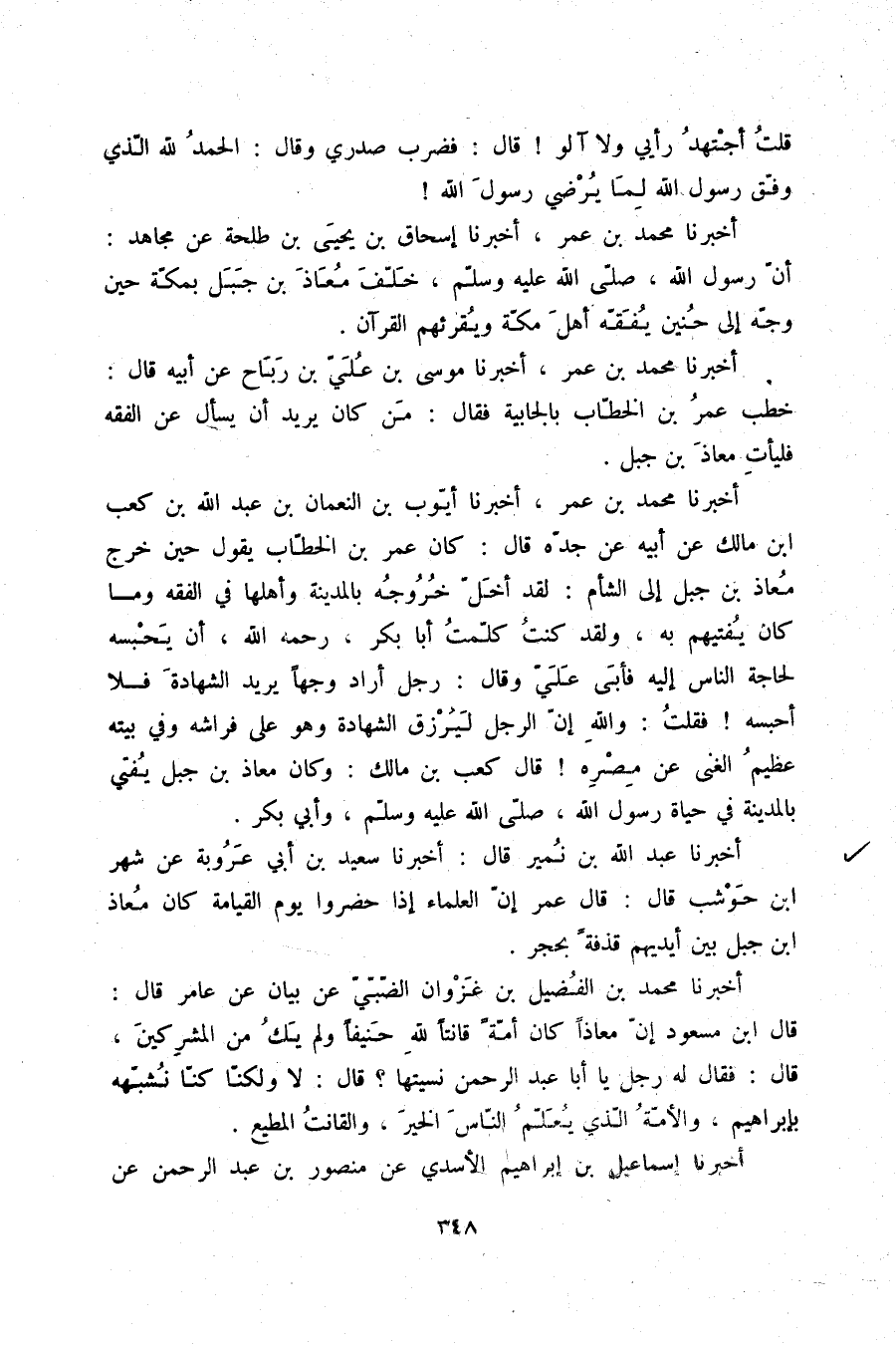 أَخْبَرَنَا عَبْدُ اللَّهِ بْنُ نُمَيْرٍ، قَالَ: أَخْبَرَنَا سَعِيدُ بْنُ أَبِي عَرُوبَةَ عَنْ شَهْرِ بْنِ حَوْشَبٍ، قَالَ: قَالَ عُمَرُ: «§إِنَّ الْعُلَمَاءَ إِذَا حَضَرُوا يَوْمَ الْقِيَامَةِ كَانَ مُعَاذُ بْنُ جَبَلٍ بَيْنَ أَيْدِيهِمْ قَذْفَةً بِحَجَرٍ»