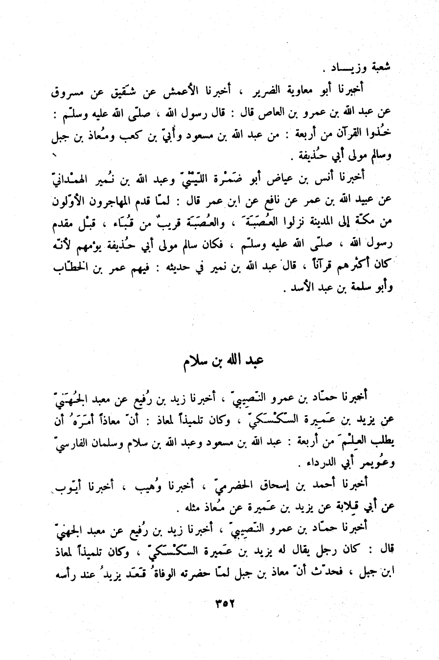 أَخْبَرَنَا أَبُو مُعَاوِيَةَ الضَّرِيرُ، أَخْبَرَنَا الْأَعْمَشُ، عَنْ شَقِيقٍ، عَنْ مَسْرُوقٍ، عَنْ عَبْدِ اللَّهِ بْنِ عَمْرِو بْنِ الْعَاصِ، قَالَ: قَالَ رَسُولُ اللَّهِ صلّى الله عليه وسلم: " §خُذُوا الْقُرْآنَ مِنْ أَرْبَعَةٍ: مِنْ عَبْدِ اللَّهِ بْنِ مَسْعُودٍ وَأُبَيِّ بْنِ كَعْبٍ وَمُعَاذِ بْنِ جَبَلٍ وَسَالِمٍ مَوْلَى أَبِي حُذَيْفَةَ "