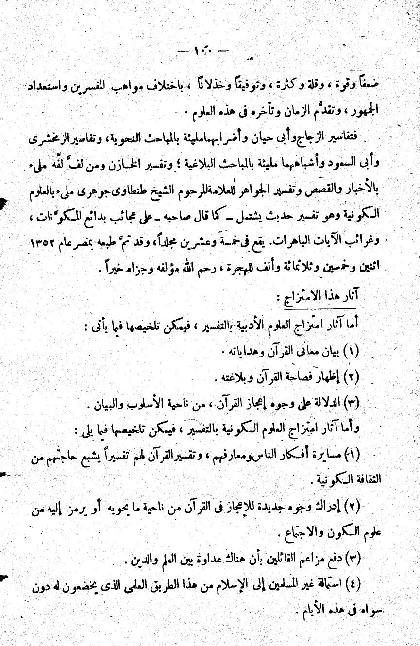 فتفاسير الزجاج وأبي حبان وأضرابهما مليئة بالمباحث النحوية وتفاسير الزمخشري وأبي السعود وأشباههما مليئة بالمباحث البلاغية وتفسير الخازن ومن لف لفه مليء بالأخبار والقصص وتفسير الجواهر للعلامة المرحوم الشيخ طنطاوي جوهري مليء بالعلوم الكونية وهو تفسير حديث يشتمل كما قال صاحبه على عجائب بدائع المكونات وغرائب الآيات الباهرات يقع في خمسة وعشرين مجلدا وقد تم طبعه بمصر عام 1352 اثنين وخمسين وثلاثمائة وألف للهجرة رحم الله مؤلفه وجزاه خيرا.