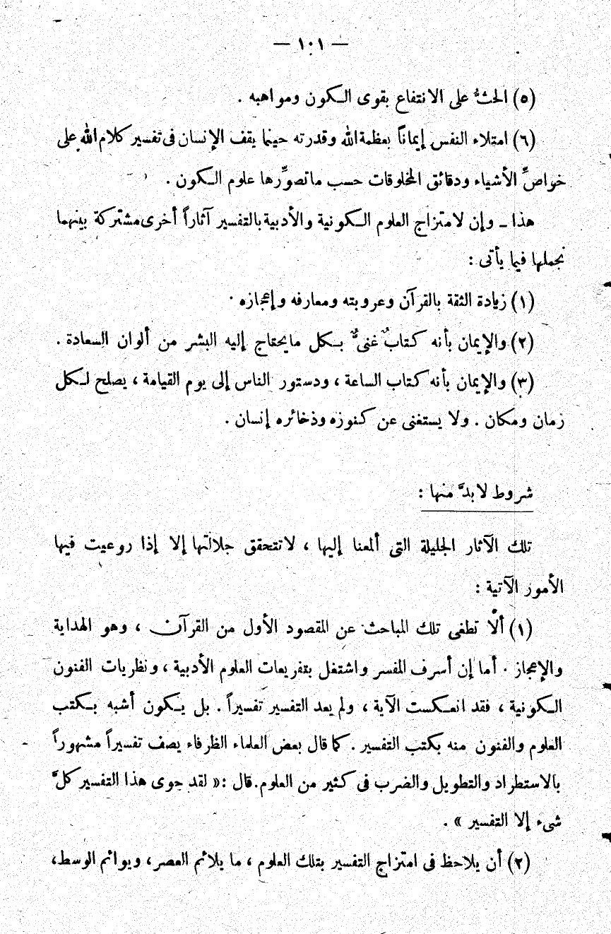 1 - ألا تطغى تلك المباحث عن المقصود الأول من القرآن وهو الهداية والإعجاز أما إن أسرف المفسر واشتغل بتفريعات العلوم الأدبية ونظريات الفنون الكونية فقد انعكست الآية ولم يعد التفسير تفسيرا بل يكون أشبه بكتب العلوم والفنون منه بكتب التفسير كما قال بعض العلماء الظرفاء يصف تفسيرا مشهورا بالاستطراد والتطويل والضرب في كثير من العلوم قال لقد حوى هذا التفسير كل شيء إلا التفسير.