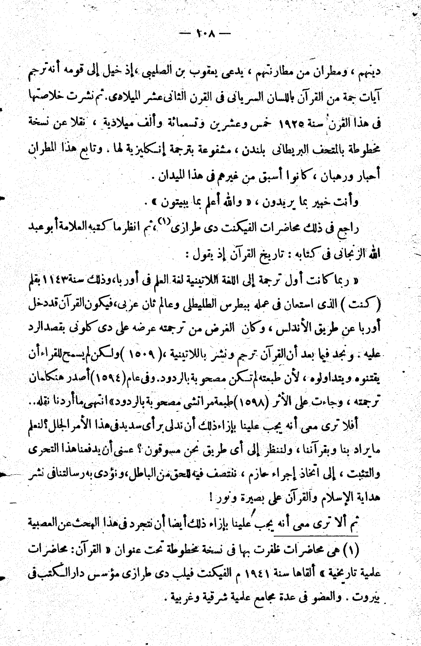 1 هي محاضرات ظفرت بها عليننا في نسخة مخطوطة تحت عنوان "القرآن: محاضرات علمية تاريخية" ألقاها سنة 1941م الفيكنت فليب طرازي مؤسس دار الكتب في بيروت. والعضو في عدة مجامع علمية شرقية وغربية.