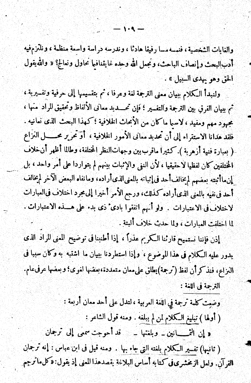 ولنبدأ الكلام ببيان معنى الترجمة لغة وعرفا ثم بتقسيمها إلى حرفية وتفسيرية ثم ببيان الفرق بين الترجمة والتفسير فإن تحديد معاني الألفاظ وتحقيق المراد منها مجهود مهم ومفيد لا سيما ما كان من الأبحاث الخلافية كهذا البحث الذي نعانيه فلقد هدانا الاستقراء إلى أن تحديد معاني الأمور الخلافية أو تحرير محل النزاع بعبارة فنية أزهرية كثيرا ما قرب بين وجهات النظر المختلفة وطالما أظهر أن خلاف المختلفين كان لفظيا لا حقيقيا لأن النفي والإثبات بينهم لم يتواردا على أمر واحد بل إن ما أثبته بعضهم لم يخالف أحد في إثباته بالمعنى الذي أراده وما نفاه البعض الآخر لم يخالف أحد في نفيه بالمعنى الذي أراده كذلك ورجع الأمر أخيرا إلى مجرد اختلاف في العبارات لاختلاف في الاعتبارات ولو أنهم اتفقوا بادئ ذي بدء على هذه الاعتبارات لما اختلفت العبارات ولما حدث خلاف ألبتة.