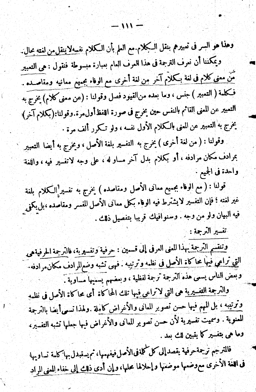 ويمكننا أن نعرف الترجمة في هذا العرف العام بعبارة مبسوطة فنقول هي التعبير من معنى كلام في لغة بكلام آخر في لغة أخرى مع الوفاء بجميع معانيه ومقاصده فكلمة التعبير جنس وما بعده من القيود فصل وقولنا عن معنى كلام يخرج به التعبير عن المعنى القائم بالنفس حين يخرج في صورة اللفظ أول مرة وقولنا بكلام آخر يخرج به التعبير عن المعنى بالكلام الأول نفسه ولو تكرر ألف مرة.