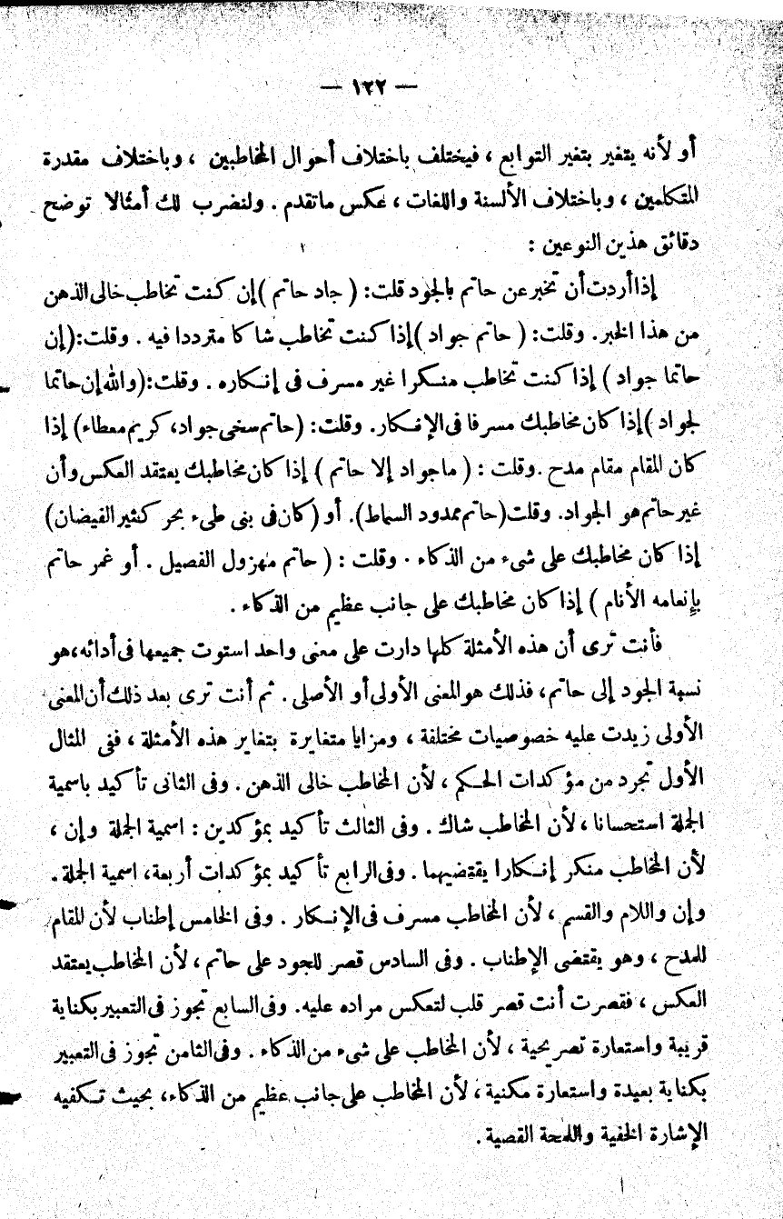 إذا أردت أن تخبر عن حاتم بالجود قلت جاد حاتم إن كنت تخاطب خالي الذهن من هذا الخبر وقلت حاتم جواد إذا كنت تخاطب شاكا مترددا فيه وقلت إن حاتما جواد إذا كنت تخاطب منكرا غير مسرف في إنكاره وقلت والله إن حاتما لجواد إذا كان مخاطبك مسرفا في الإنكار وقلت حاتم سخي جواد كريم معطاء إذا كان المقام مقام مدح وقلت ما جواد إلا حاتم إذا كان مخاطبك يعتقد العكس وأن غير حاتم هو الجواد وقلت حاتم ممدود السماط أو كان في بني طيء بحر كثير الفيضان إذا كان على شيء من الذكاء وقلت حاتم مهزول الفصيل أو غمر حاتم بإنعامه الأنام إذا كان مخاطبك على جانب عظيم من الذكاء.