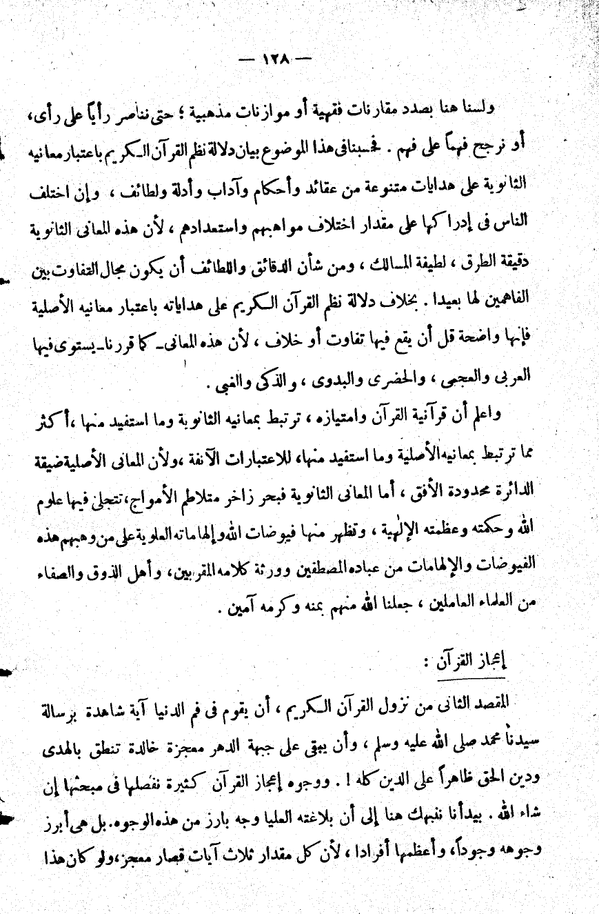 واعلم أن قرآنية القرآن وامتيازه ترتبط بمعانيه الثانوية وما استفيد منها أكثر مما ترتبط بمعانيه الأصلية وما استفيد منها للاعتبارات الآنفة ولأن المعاني الأصلية ضيقة الدائرة محدودة الأفق أما المعاني الثانوية فبحر زاخر متلاطم الأمواج تتجلى فيها علوم الله وحكمته وعظمته الإلهية وتظهر منها فيوضات الله وإلهاماته العلوية على من وهبهم هذه الفيوضات والإلهامات من عباده المصطفين وورثة كلامه المقربين وأهل الذوق والصفاء من العلماء العاملين جعلنا الله منهم بمنه وكرمه آمين.