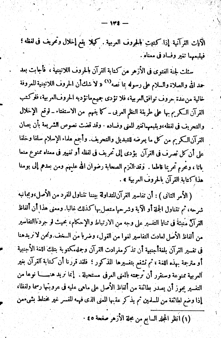 سئلت لجنة الفتوى في الأزهر عن كتابة القرآن بالحروف اللاتينية فأجابت بعد حمد الله والصلاة والسلام على رسوله بما نصه1 لا شك أن الحروف اللاتينية المعروفة خالية من عدة حروف توافق العربية فلا تؤدي جميع ما تؤديه الحروف العربية فلو كتب القرآن الكريم بها على طريقة النظم العربي كما يفهم من الاستفتاء لوقع الإخلال والتحريف في لفظه ويتبعهما تغير المعنى وفساده وقد قضت نصوص الشريعة بأن يصان القرآن الكريم من كل ما يعرضه للتبديل والتحريف وأجمع علماء الإسلام سلفا وخلفا على أن كل تصرف في القرآن يؤدي إلى تحريف في لفظه أو تغيير في معناه ممنوع منعا باتا ومحرم تحريما قاطعا وقد التزم الصحابة رضوان الله عليهم ومن بعدهم إلى يومنا هذا كتابة القرآن بالحروف العربية.
