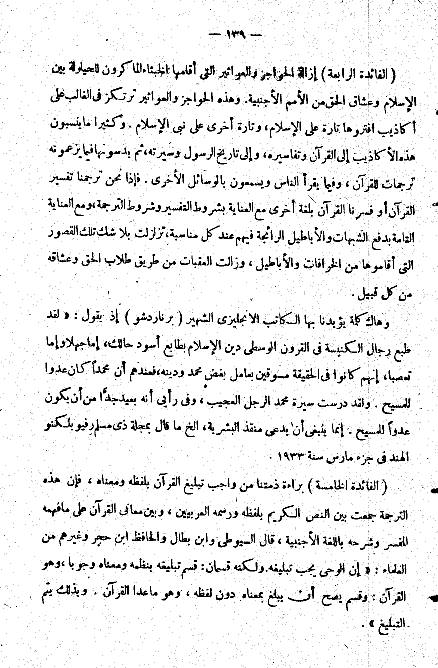 الفائدة الرابعة إزالة الحواجز والعواثير التي أقامها الخبثاء الماكرون للحيلولة بين الإسلام وعشاق الحق من الأمم الأجنبية وهذه الحواجز والعواثير ترتكز في الغالب على أكاذيب افتروها تارة على الإسلام وتارة أخرى على نبي الإسلام وكثيرا ما ينسبون هذه الأكاذيب إلى القرآن وتفاسيره وإلى تاريخ الرسول صلى الله عليه وسلم وسيرته ثم يدسونها فيما يزعمونه ترجمات للقرآن وفيما يقرأ الناس ويسمعون بالوسائل الأخرى فإذا نحن ترجمنا تفسير القرآن أو فسرنا القرآن بلغة أخرى مع العناية بشروط التفسير وشروط الترجمة ومع العناية التامة بدفع الشبهات والأباطيل الرائجة فيهم عند كل مناسبة تزلزلت بلا شك تلك القصور التي أقاموها من الخرافات والأباطيل وزالت العقبات من طريق طلاب الحق وعشاقه من كل قبيل.