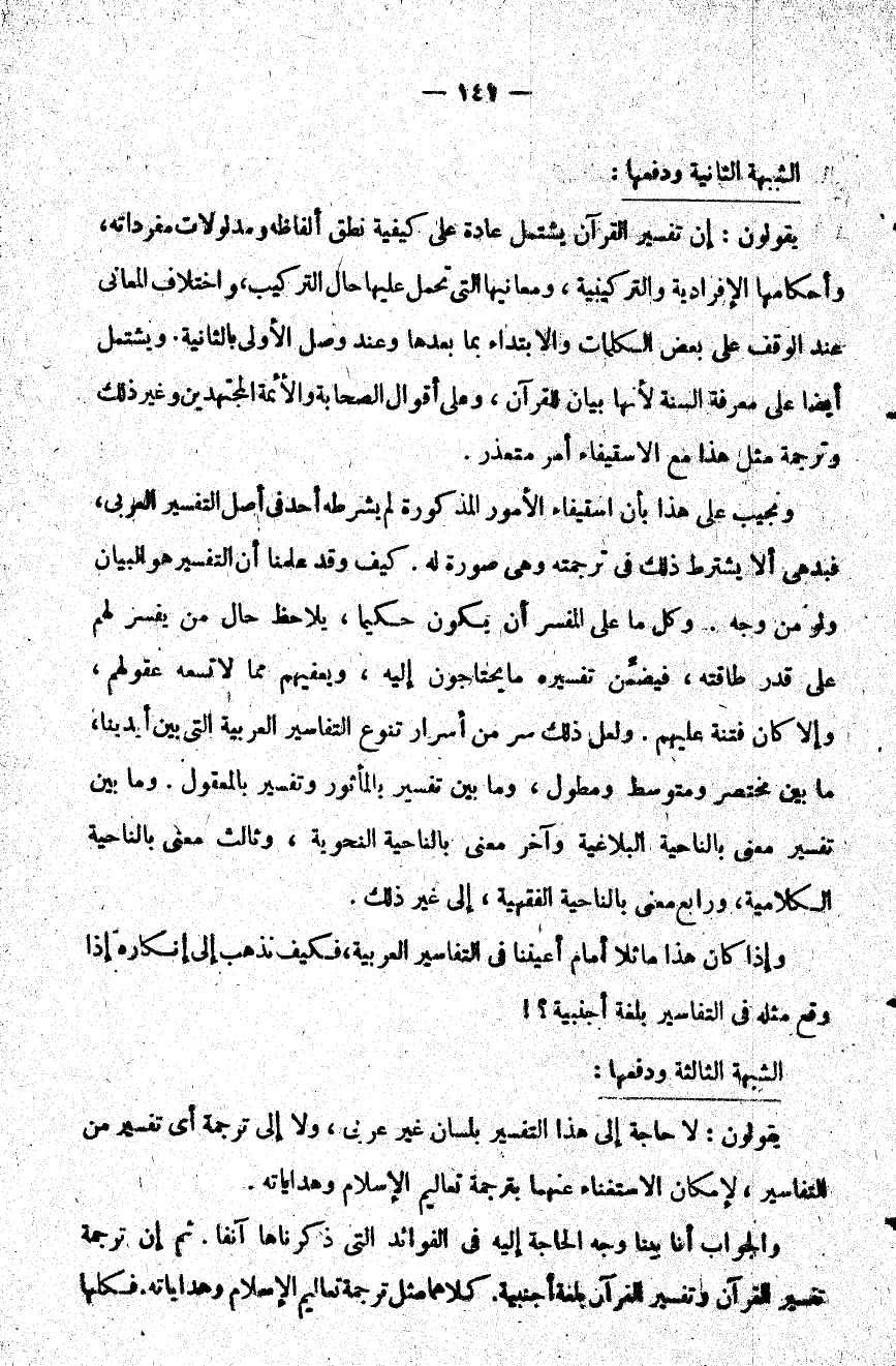 يقولون لا حاجة إلى هذا التفسير بلسان غير عربي ولا إلى ترجمة أي تفسير من التفاسير لإمكان الاستغناء عنهما بترجمة تعاليم الإسلام وهداياته.