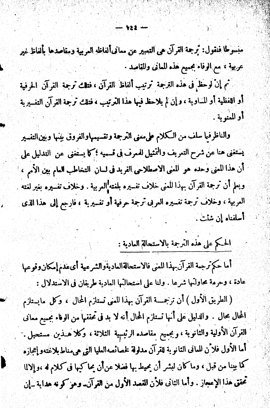 الطريق الأول أن ترجمة القرآن بهذا المعنى تستلزم المحال وكل ما يستلزم المحال محال والدليل على أنها تستلزم المحال أنه لا بد في تحققها من الوفاء بجميع معاني القرآن الأولية والثانوية وبجميع مقاصده الرئيسية الثلاثة وكلا هذين مستحيل أما الأول فلأن المعاني الثانوية للقرآن مدلولة لخصائصه العليا التي هي مناط بلاغته وإعجازه كما بينا من قبل وما كان لبشر أن يحيط بها فضلا عن أن يحاكيها في كلام له وإلا لما تحقق هذا الإعجاز وأما الثاني فلأن المقصد الأول من القرآن وهو كونه هداية إن