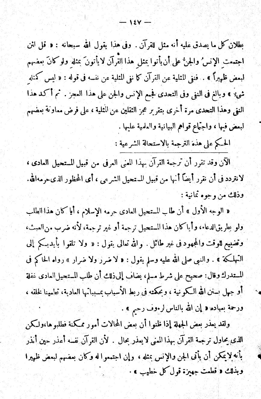 ولقد يعذر بعض الجهلة إذا ظنوا أن بعض المحالات أمور ممكنة فطلبوها ولكن الذي يحاول ترجمة القرآن بهذا المعنى لا يعذر بحال لأن القرآن نفسه أعذر حين أنذر بأنه لا يمكن أن يأتي الجن والإنس بمثله وإن اجتمعوا له وكان بعضهم لبعض ظهيرا وبذلك قطعت جهيزة قول كل خطيب.