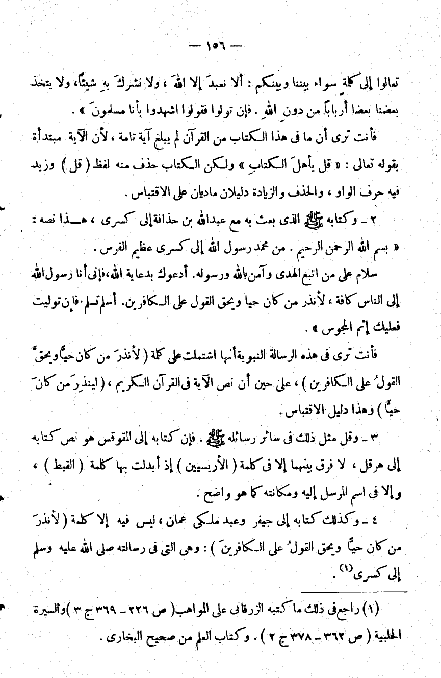 4 - وكذلك كتابه إلى جيفر وعبد ملكي عمان ليس فيه إلا كلمة لأنذر من كان حيا ويحق القول على الكافرين وهي التي في رسالته إلى كسرى1