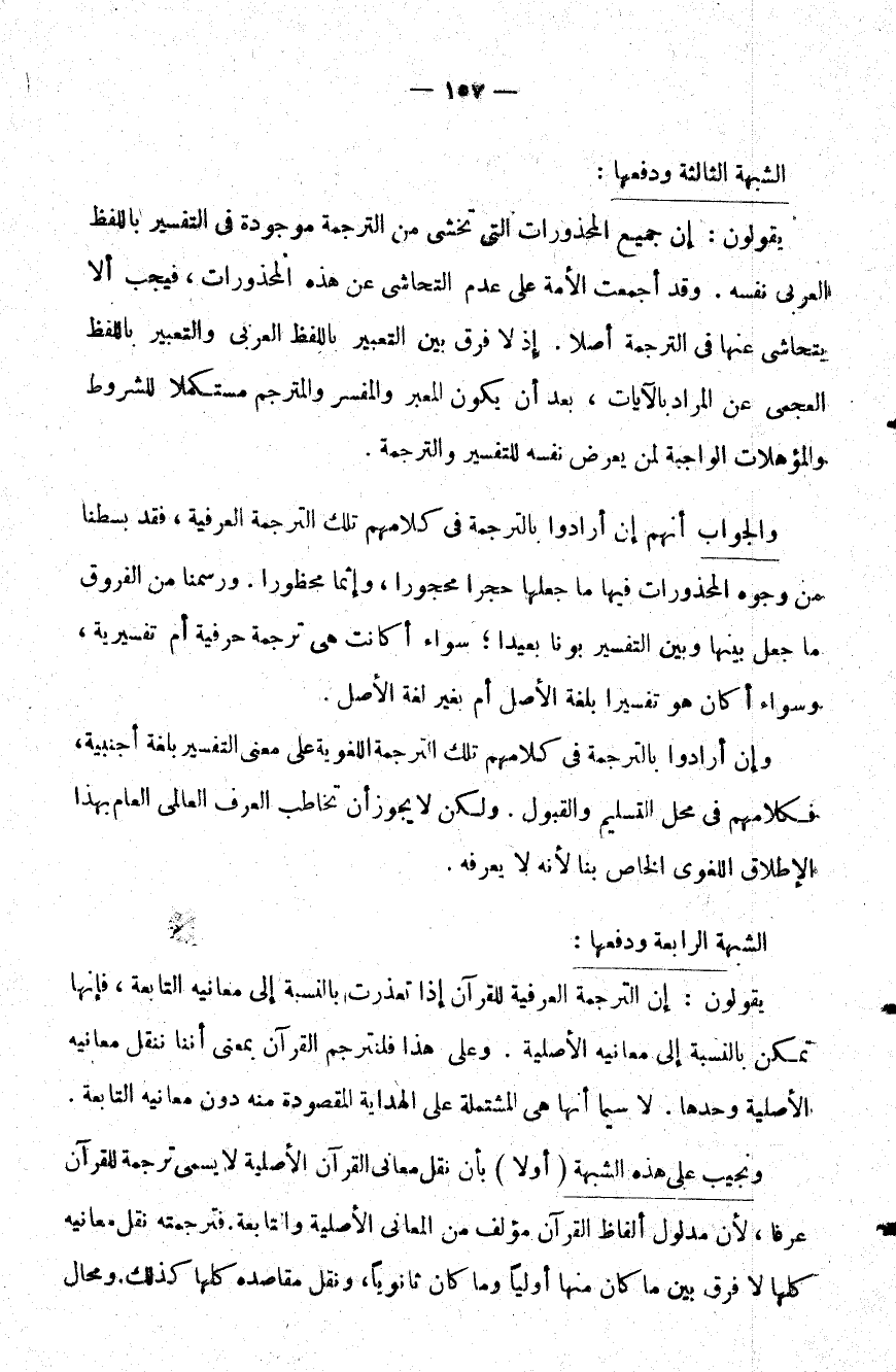 والجواب: أنهم إن أرادوا بالترجمة في كلامهم تلك الترجمة العرفية فقد بسطنا من وجوه المحذورات فيها ما جعلها حجرا محجورا وإثما محظورا ورسمنا من الفروق ما جعل بينها وبين التفسير بونا بعيدا سواء أكانت هي ترجمة حرفية أم تفسيرية وسواء أكان هو تفسيرا بلغة الأصل أم بغير لغة الأصل.
