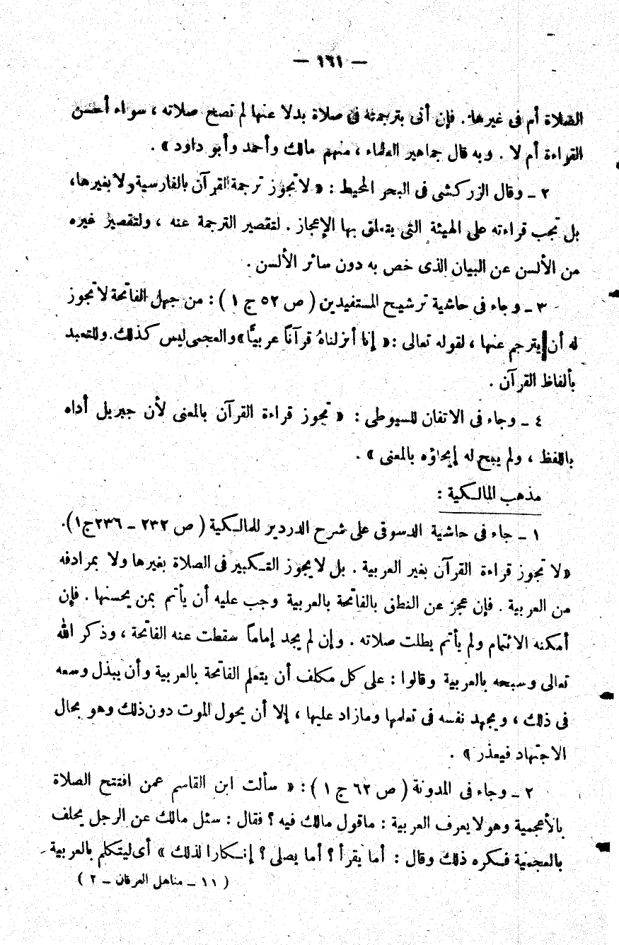 1 - جاء في حاشية الدسوقي على شرح الدردير للمالكية "ص 232 – 236 ج 1" لا تجوز قراءة القرآن بغير العربية بل لا يجوز التكبير في الصلاة بغيرها ولا بمرادفه من العربية فإن عجز عن النطق بالفاتحة بالعربية وجب عليه أن يأتم بمن يحسنها فإن أمكنه الائتمام ولم يأتم بطلت صلاته وإن لم يجد إماما سقطت عنه الفاتحة وذكر الله تعالى وسبحه بالعربية وقالوا على كل مكلف أن يتعلم الفاتحة بالعربية وأن يبذل وسعه في ذلك ويجهد نفسه في تعلمها وما زاد عليها إلا أن يحول الموت دون ذلك وهو بحال الاجتهاد فيعذر.