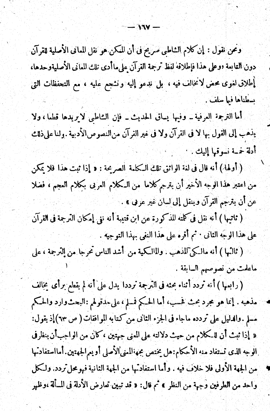 أولها أنه قال في لغة الواثق تلك الكلمة الصريحة إذا ثبت فلا يمكن من اعتبر هذا الوجه الأخير أن يترجم كلاما من الكلام العربي بكلام العجم فضلا عن أن يترجم القرآن وينقل إلى لسان غير عربي.