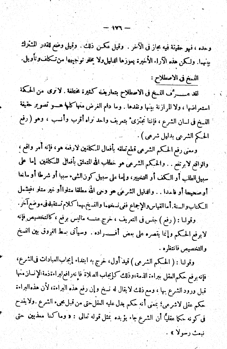 ومعنى رفع الحكم الشرعي قطع تعلقه بأفعال المكلفين لا رفعه هو فإنه أمر واقع والواقع لا يرتفع والحكم الشرعي هو خطاب الله المتعلق بأفعال المكلفين إما على سبيل الطلب أو الكف أو التخيير وإما على سبيل كون الشيء سببا أو شرطا أو مانعا أو صحيحا أو فاسدا والدليل الشرعي هو وحي الله مطلقا متلوا أو غير متلو فيشمل الكتاب والسنة أما القياس والإجماع ففي نسخهما والنسخ بهما كلام تستقبله في موضع آخر.
