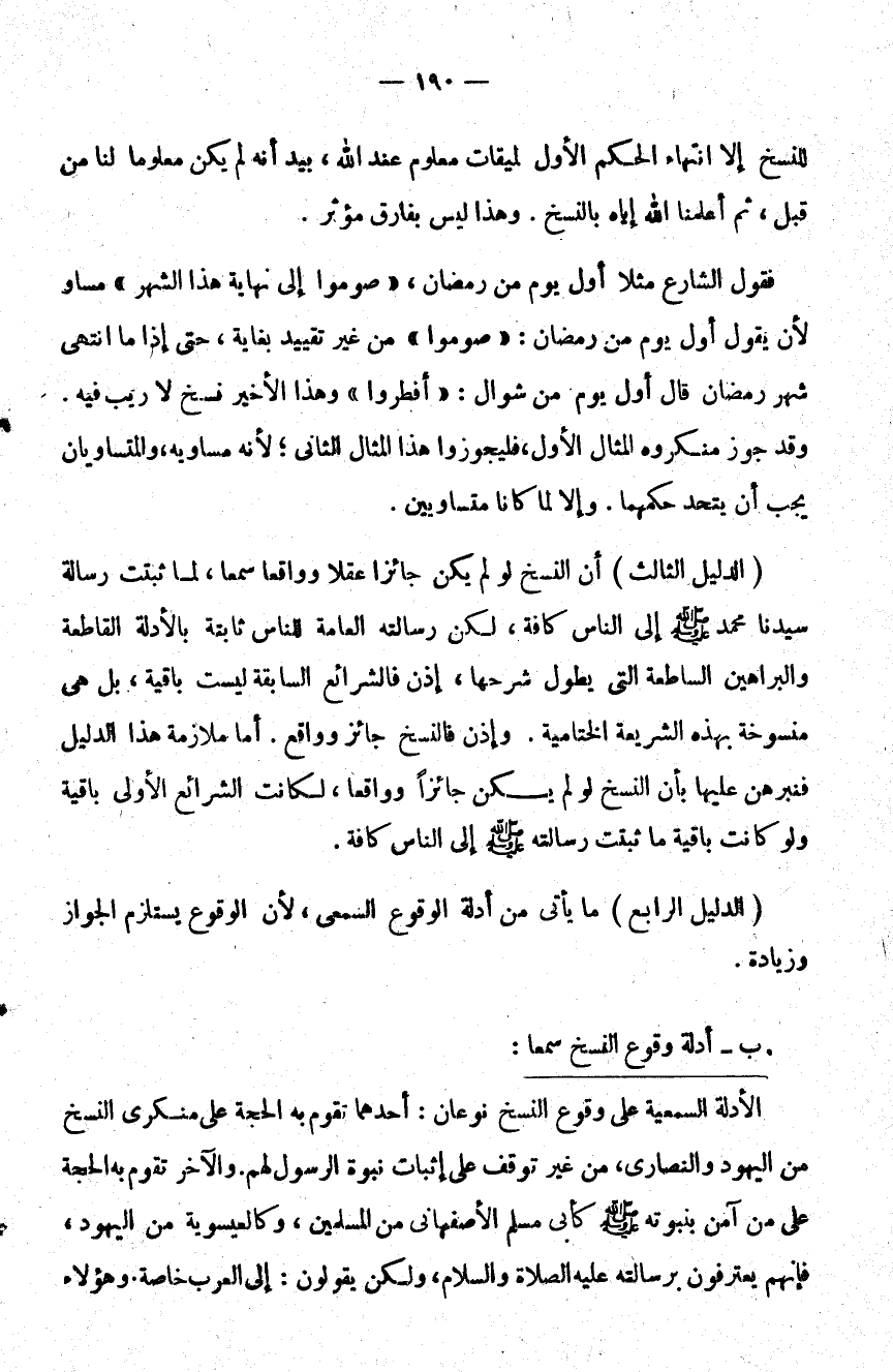 الأدلة السمعية على وقوع النسخ نوعان أحدهما تقوم به الحجة على منكري النسخ من اليهود والنصارى من غير توقف على إثبات نبوة الرسول صلى الله عليه وسلم لهم والآخر تقوم به الحجة على من آمن بنبوته كأبي مسلم الأصفهاني من المسلمين وكالعيسوية من اليهود فإنهم يعترفون برسالته عليه الصلاة والسلام ولكن يقولون إلى العرب خاصة وهؤلاء