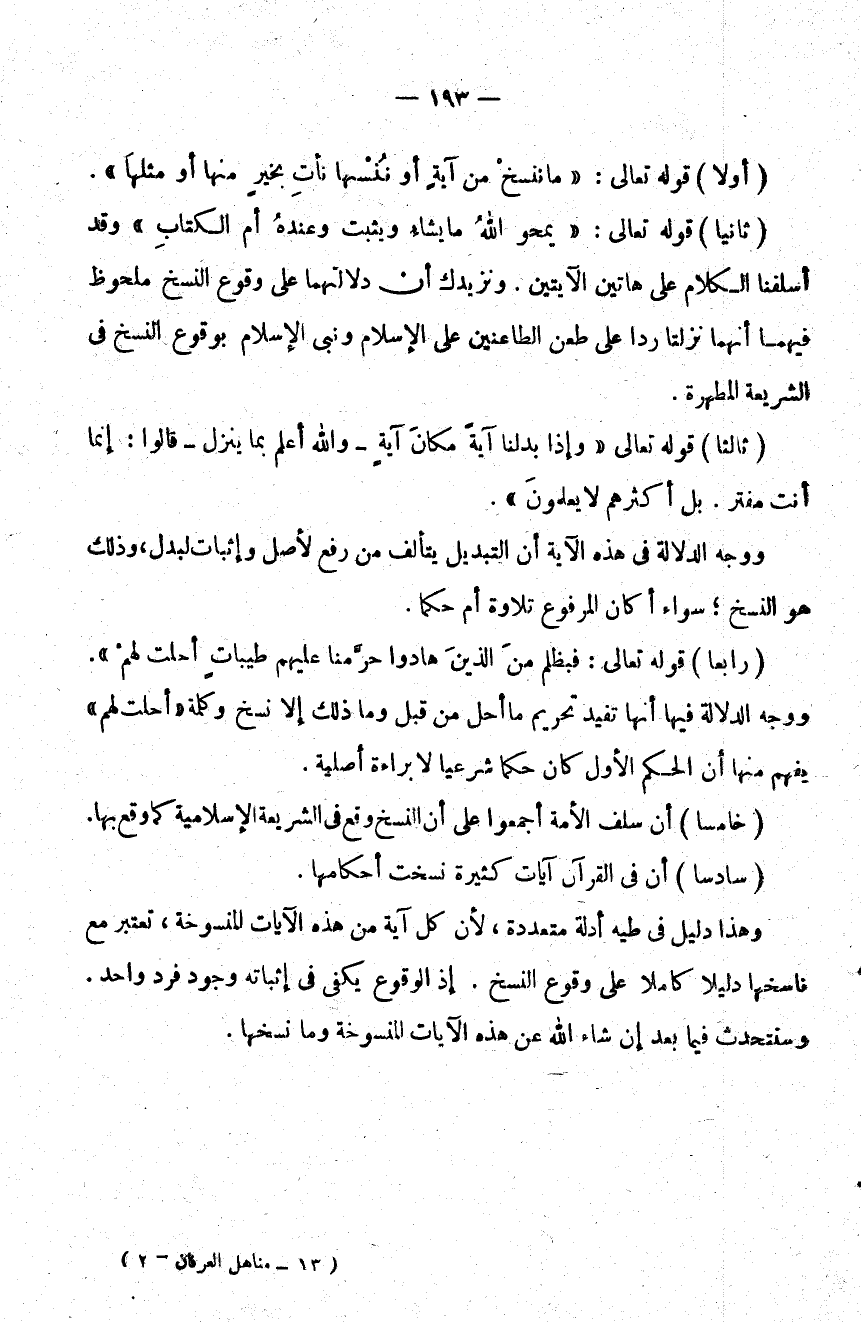 ثانيا قوله تعالى: {يَمْحُوا اللَّهُ مَا يَشَاءُ وَيُثْبِتُ وَعِنْدَهُ أُمُّ الْكِتَابِ} وقد أسلفنا الكلام على هاتين الآيتين ونزيدك أن دلالتهما على وقوع النسخ ملحوظ فيهما أنهما نزلتا ردا على طعن الطاعنين على الإسلام ونبي الإسلام بوقوع النسخ في الشريعة المطهرة.