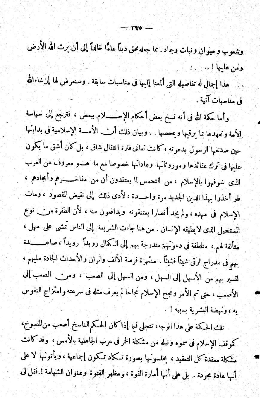 وأما حكمة الله في أنه نسخ بعض أحكام الإسلام ببعض فترجع إلى سياسة الأمة وتعهدها بما يرقيها ويمحصها وبيان ذلك أن الأمة الإسلامية في بدايتها حين صدعها الرسول بدعوته كانت تعاني فترة انتقال شاق بل كان أشق ما يكون عليها في ترك عقائدها وموروثاتها وعادتها خصوصا مع ما هو معروف عن العرب الذين شوفهوا بالإسلام من التحمس لما يعتقدون أنه من مفاخرهم وأمجادهم فلو أخذوا بهذا الدين الجديد مرة واحدة لأدى ذلك إلى نقيض المقصود ومات الإسلام في مهده ولم يجد أنصارا يعتنقونه ويدافعون عنه لأن الطفرة من نوع المستحيل الذي لا يطيقه الإنسان من هنا جاءت الشريعة إلى الناس تمشي على مهل متألفة لهم متلطفة في دعوتهم متدرجة بهم إلى الكمال رويدا رويدا صاعدة بهم في مدارج الرقي شيئا فشيئا منتهزة فرصة الألف والمران والأحداث الجادة عليهم لتسير بهم من الأسهل إلى السهل ومن السهل إلى الصعب ومن الصعب إلى الأصعب حتى تم الأمر ونجح الإسلام نجاحا لم يعرف مثله في سرعته وامتزاج النفوس به ونهضة البشرية بسببه!.