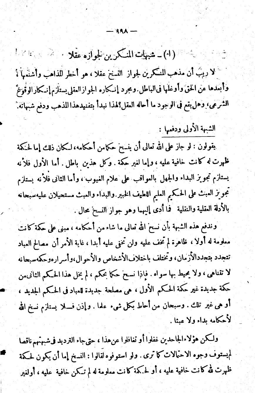 لا ريب أن مذهب المنكرين لجواز النسخ عقلا هو أخطر المذاهب وأشنعها وأبعدها عن الحق وأوغلها في الباطل ومجرد إنكاره الجواز العقلي يستلزم إنكار الوقوع الشرعي وهل يقع في الوجود ما أحاله العقل لهذا نبدأ بتفنيد هذا المذهب ودفع شبهاته.