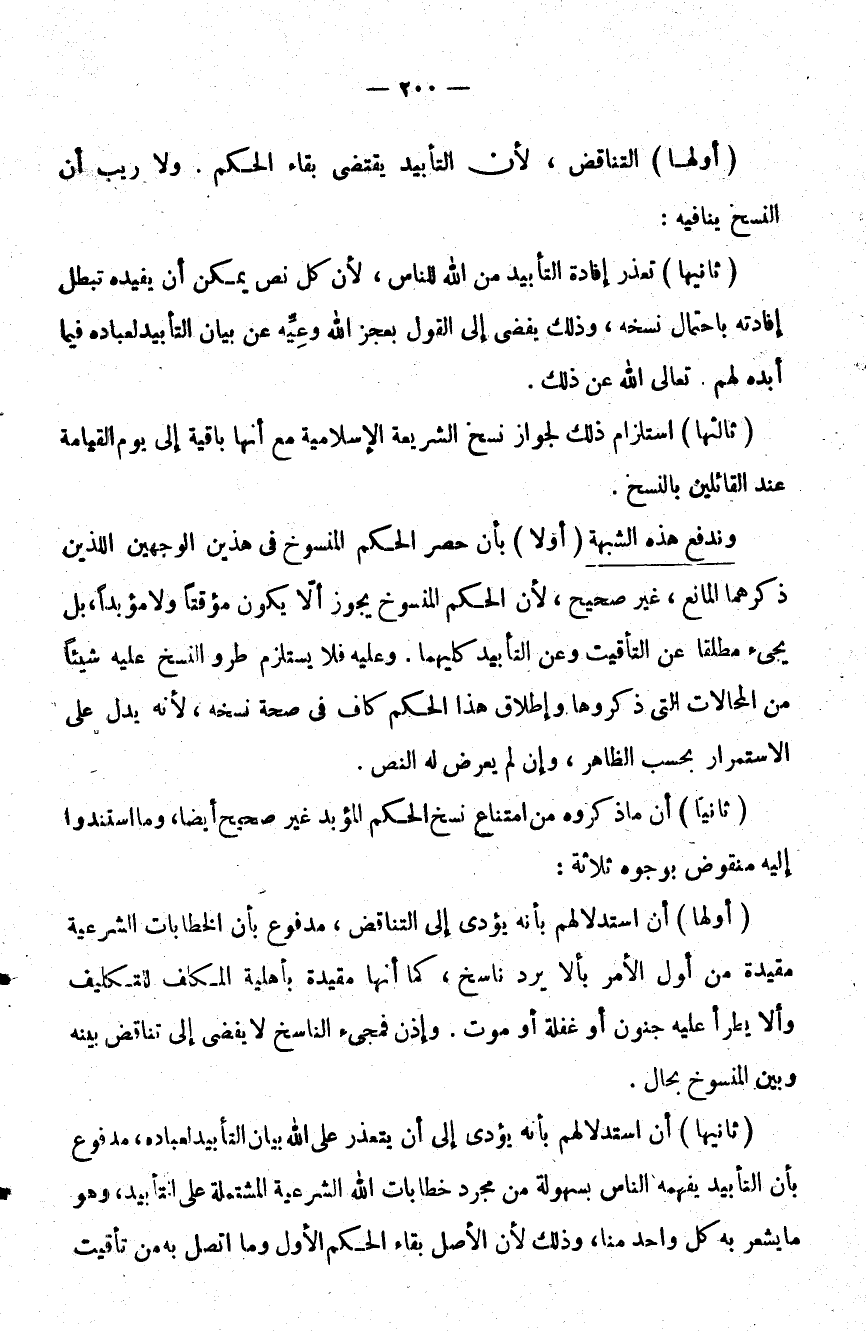 أولها أن استدلالهم بأنه يؤدي إلىالتناقض مدفوع بأن الخطابات الشرعية مقيدة من أول الأمر بألا يرد ناسخ كما أنها مقيدة بأهلية المكلف لتكليف وألا يطرأ عليه جنون أو غفلة أو موت وإذن فمجيء الناسخ لا يفضي إلى تناقض بينه وبين المنسوخ بحال.