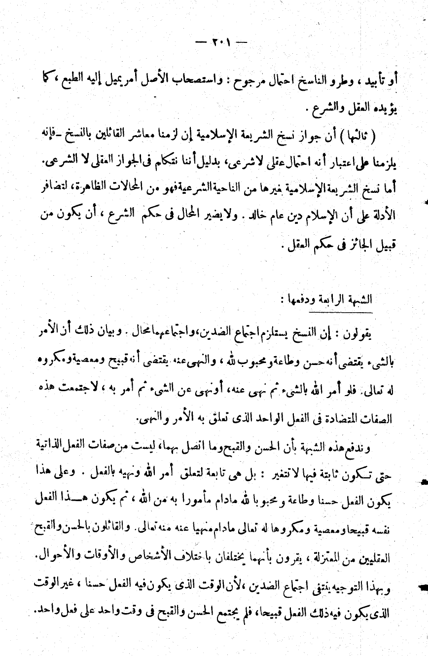 ثالثها أن جواز نسخ الشريعة الإسلامية إن لزمنا معاشر القائلين بالنسخ فإنه يلزمنا على اعتبار أنه احتمال عقلي لا شرعي بدليل أننا نتكلم في الجواز العقلي لا الشرعي أما نسخ الشريعة الإسلامية بغيرها من الناحية الشرعية فهو من المحالات الظاهرة لتظافر الأدلة على أن الإسلام دين عام خالد ولا يضير المحال في حكم الشرع أن يكون من قبيل الجائز في حكم العقل.