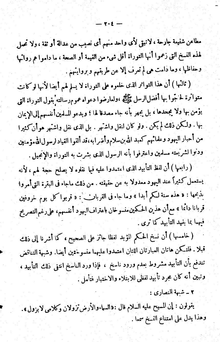 رابعها أن لفظ التأبيد الذي اعتمدوا عليه فيما نقلوه لا يصلح حجة لهم لأنه يستعمل كثيرا عند اليهود معدولا به عن حقيقة من ذلك ما جاء في البقرة التي أمروا بذبحها هذه سنة لكم أبدا وما جاء في القربان قربوا كل يوم خروفين قربانا دائما مع أن هذين الحكمين منسوخان باعتراف اليهود أنفسهم على رغم التصريح فيهما بما يفيد التأبيد كما ترى.