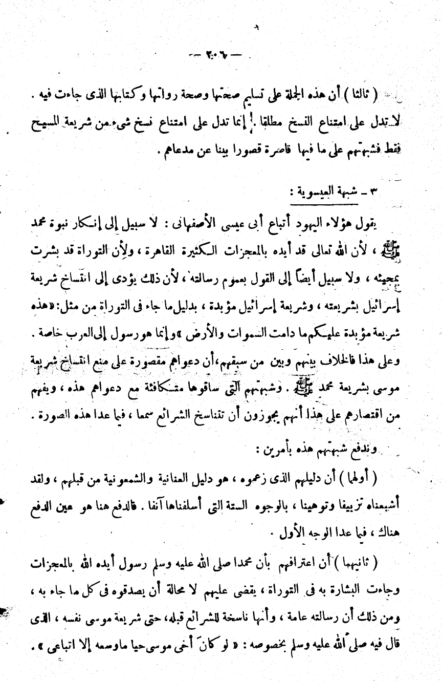 يقول هؤلاء اليهود أتباع أبي عيسى الأصفهاني لا سبيل إلى إنكار نبوة محمد لأن الله تعالى قد أيده بالمعجزات الكثيرة القاهرة ولأن التوراة قد بشرت بمجيئه ولا سبيل أيضا إلى القول بعموم رسالته لأن ذلك يؤدي إلى انتساخ شريعة إسرائيل بشريعته وشريعة إسرائيل مؤبدة بدليل ما جاء في التوراة من مثل هذه شريعة مؤبدة عليكم ما دامت السموات والأرض وإنما هو رسول إلى العرب خاصة وعلى هذا فالخلاف بينهم وبين من سبقهم أن دعواهم مقصورة على منع انتساخ شريعة موسى بشريعة محمد وشبهتهم التي ساقوها متكافئة مع دعواهم هذه ويفهم من اقتصارهم على هذا أنهم يجوزون أن تتناسخ الشرائع سمعا فيما عدا هذه الصورة.
