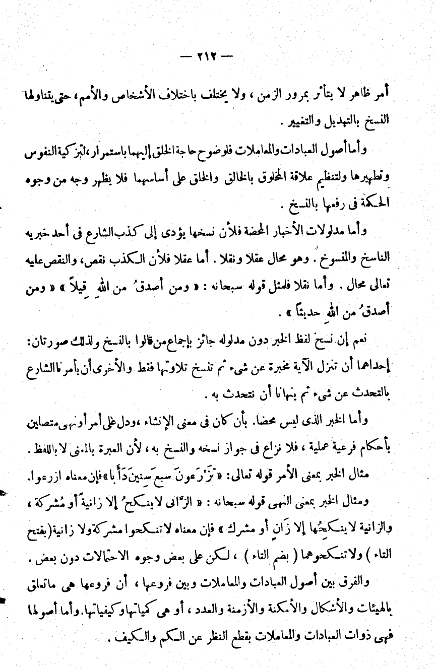 وأما أصول العبادات والمعاملات فلوضوح حاجة الخلق إليهما باستمرار لتزكية النفوس وتطهيرها ولتنظيم علاقة المخلوق بالخالق والخلق على أساسهما فلا يظهر وجه من وجوه الحكمة في رفعها بالنسخ.