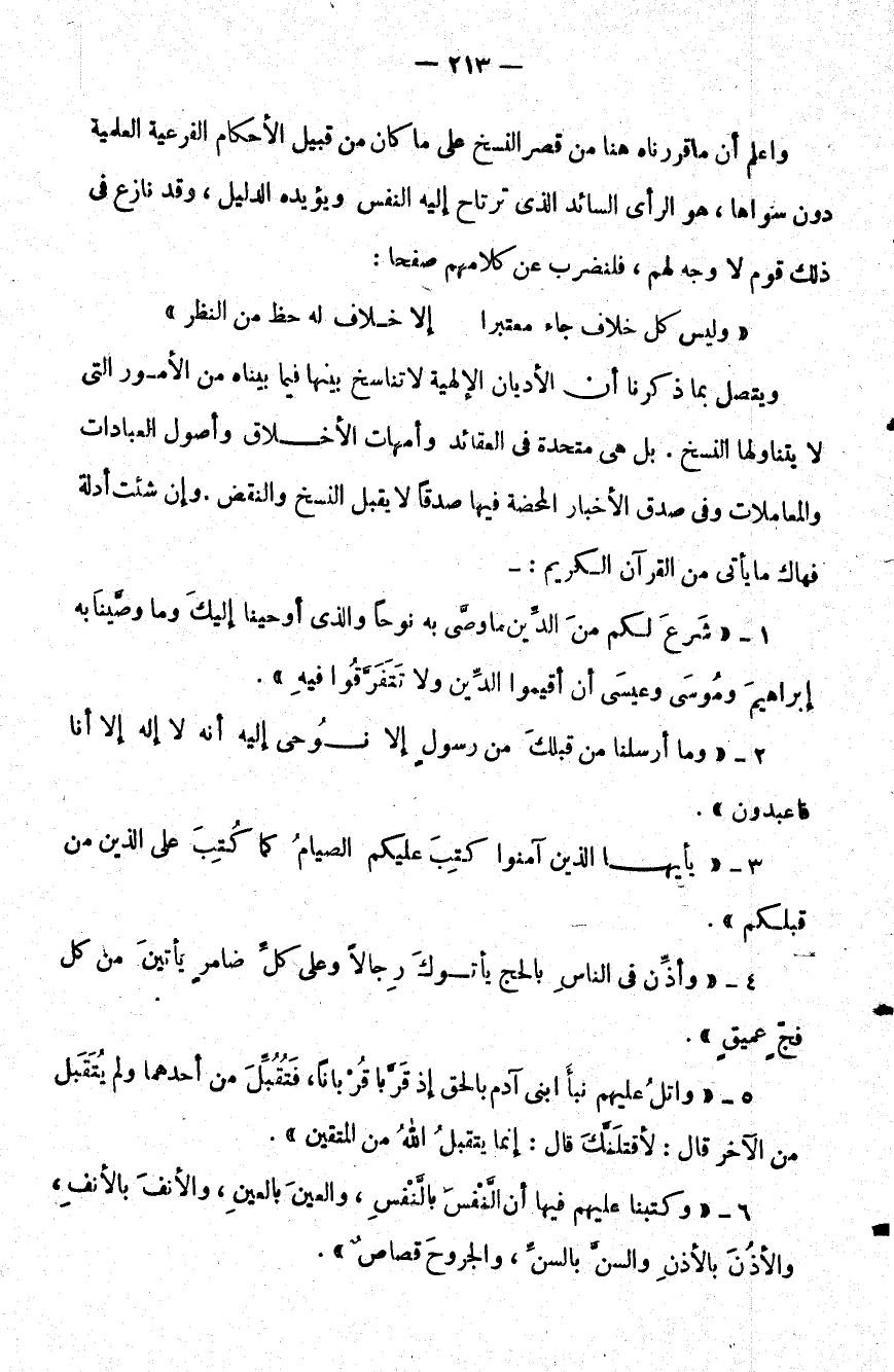 ويتصل بما ذكرنا أن الأديان الإلهية لا تناسخ بينها فيما بيناه من الأمور التي لا يتناولها النسخ بل هي متحدة في العقائد وأمهات الأخلاق وأصول العبادات والمعاملات وفي صدق الأخبار المحضة فيها صدقا لا يقبل النسخ والنقض وإن شئت أدلة فهاك ما يأتي من القرآن الكريم:
