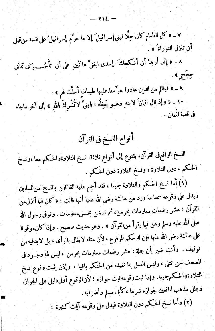 1 - أما نسخ الحكم والتلاوة جميعا فقد أجمع عليه القائلون بالنسخ من المسلمين ويدل على وقوعه سمعا ما ورد عن عائشة رضي الله عنها أنها قالت كان فيما أنزل من القرآن عشر رضعات معلومات يحرمن ثم نسخن بخمس معلومات وتوفي رسول الله صلى الله عليه وسلم وهن فيما يقرأ من القرآن وهو حديث صحيح وإذا كان موقوفا على عائشة رضي الله عنها فإن له حكم المرفوع لأن مثله لا يقال بالرأي بل لا بد فيه من توقيف وأنت خبير بأن جملة عشر رضعات معلومات يحرمن ليس لها وجود في المصحف حتى تتلى وليس العمل بما تفيده من الحكم باقيا وإذن يثبت وقوع نسخ التلاوة والحكم جميعا وإذا ثبت وقوعه ثبت جوازه لأن الوقوع أول دليل على الجواز وبطل مذهب المانعين لجوازه شرعا كأبي مسلم وأضرابه.
