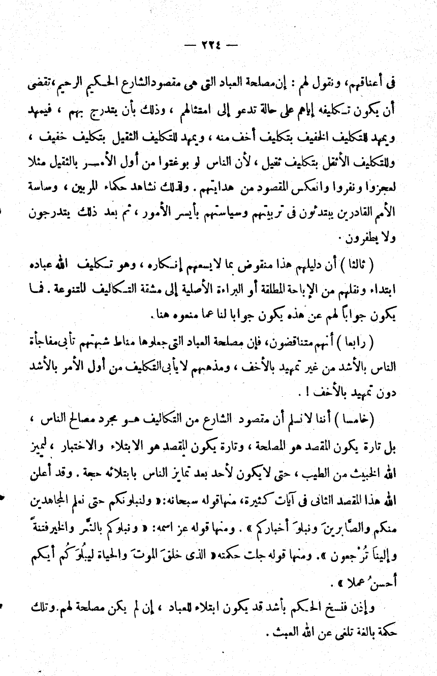 خامسا أننا لا نسلم أن مقصود الشارع من التكاليف هو مجرد مصالح الناس بل تارة يكون المقصد هو المصلحة وتارة يكون المقصد هو الابتلاء والاختبار ليميز الله الخبيث من الطيب حتى لا يكون لأحد بعد تمايز الناس بابتلائه حجة وقد أعلن الله هذا المقصد الثاني في آيات كثيرة منها قوله سبحانه: {وَلَنَبْلُوَنَّكُمْ حَتَّى نَعْلَمَ الْمُجَاهِدِينَ مِنْكُمْ وَالصَّابِرِينَ وَنَبْلُوَ أَخْبَارَكُمْ} ومنها قوله عز اسمه: {وَنَبْلُوكُمْ بِالشَّرِّ وَالْخَيْرِ فِتْنَةً وَإِلَيْنَا تُرْجَعُونَ} ومنها قوله جلت حكمته: {الَّذِي خَلَقَ الْمَوْتَ وَالْحَيَاةَ لِيَبْلُوَكُمْ أَيُّكُمْ أَحْسَنُ عَمَلاً} .