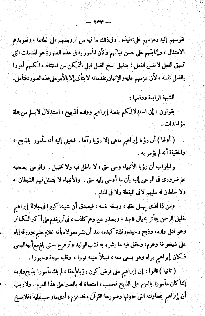 ثانيا قالوا إن إبراهيم على فرض كون رؤياه حقا لم يك مأمورا بذبح ولده إنما كان مأمورا بالعزم على الذبح فحسب امتحانا له بالصبر على هذا العزم ولا ريب أن إبراهيم بمحاولته التي حاولها وصورها القرآن قد عزم وأدى ما وجب عليه فلا نسخ.