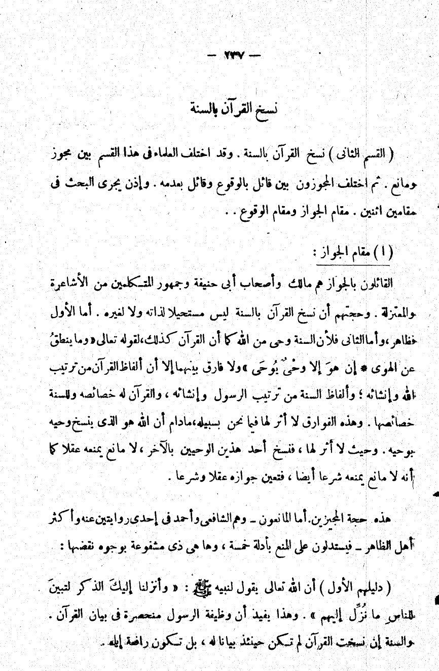 القسم الثاني نسخ القرآن بالسنة وقد اختلف العلماء في هذا القسم بين مجوز ومانع ثم اختلف المجوزون بين قائل بالوقوع وقائل بعدمه وإذن يجري البحث في مقامين اثنين مقام الجواز ومقام الوقوع.