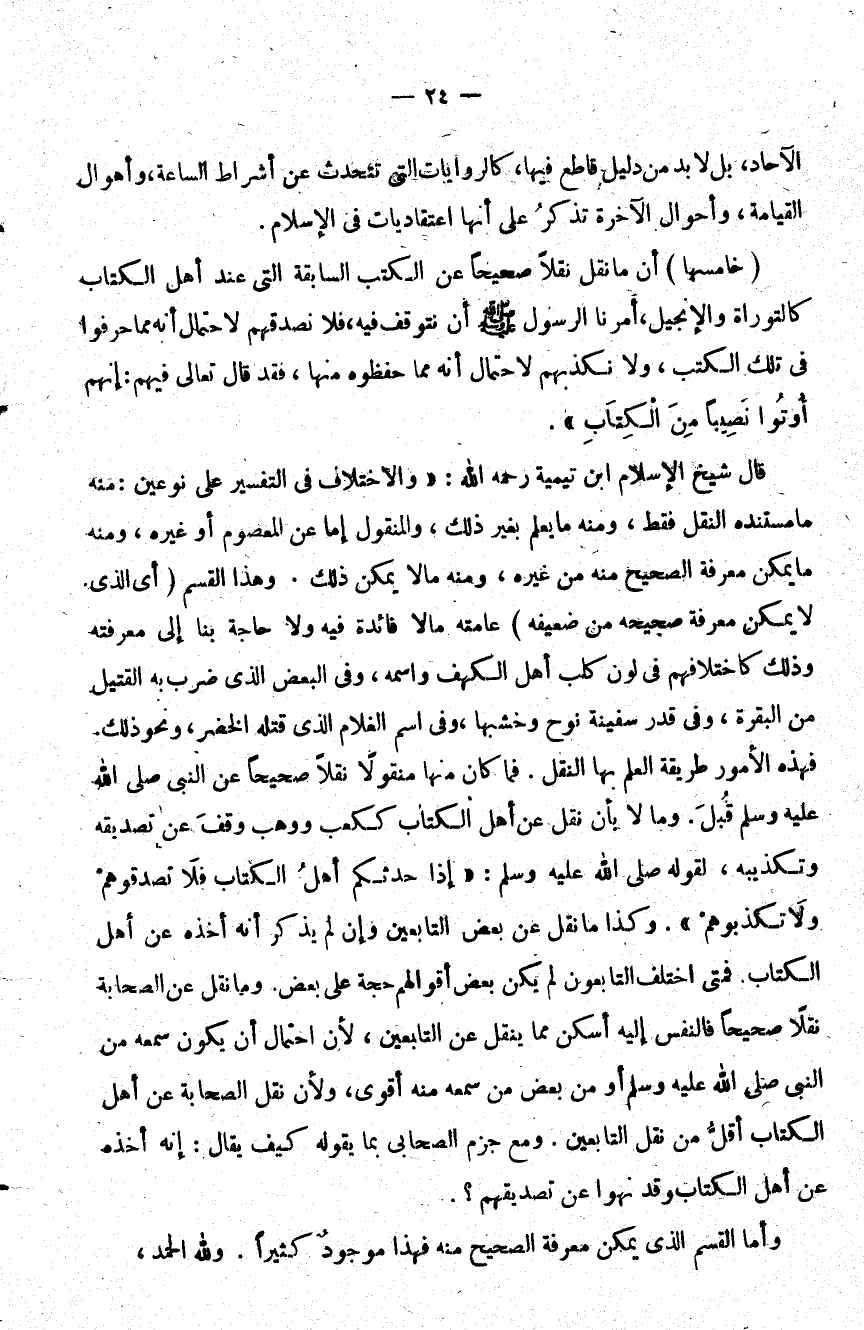 خامسها أن ما نقل نقلا صحيحا عن الكتب السابقة التي عند أهل الكتاب كالتوارة والإنجيل أمرنا الرسول صلى الله عليه وسلم أن نتوقف فيه فلا نصدقهم لاحتمال أنه مما حرفوا في تلك الكتب ولا نكذبهم لاحتمال أنه مما حفظوه منها فقد قال تعالى فيهم:إنهم {أُوتُوا نَصِيباً مِنَ الْكِتَابِ} .