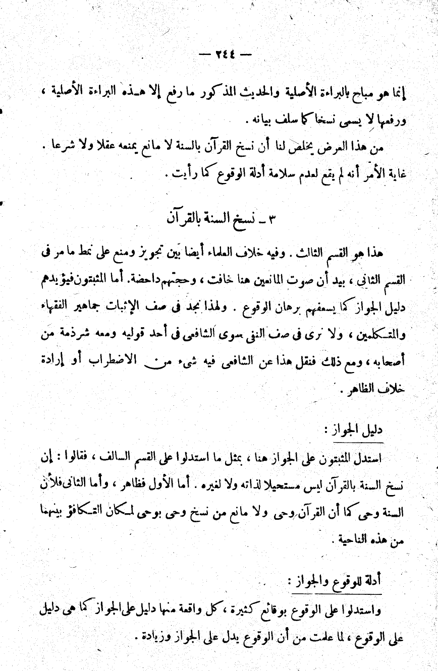 هذا هو القسم الثالث وفيه خلاف العلماء أيضا بين تجويز ومنع على نمط ما مر في القسم الثاني بيد أن صوت المانعين هنا خافت وحجتهم داحضة أما المثبتون فيؤيدهم دليل الجواز كما يسعفهم برهان الوقوع ولهذا نجد في صف الإثبات جماهير الفقهاء والمتكلمين ولا نرى في صف النفي سوى الشافعي في أحد قوليه ومعه شرذمة من أصحابه ومع ذلك فنقل هذا عن الشافعي فيه شيء من الاضطراب أو إرادة خلاف الظاهر.
