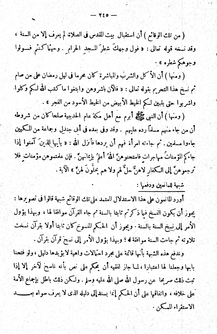 من تلك الوقائع أن استقبال بيت المقدس في الصلاة لم يعرف إلا من السنة وقد نسخه قوله تعالى: {فَوَلِّ وَجْهَكَ شَطْرَ الْمَسْجِدِ الْحَرَامِ وَحَيْثُ مَا كُنْتُمْ فَوَلُّوا وُجُوهَكُمْ شَطْرَهُ} .