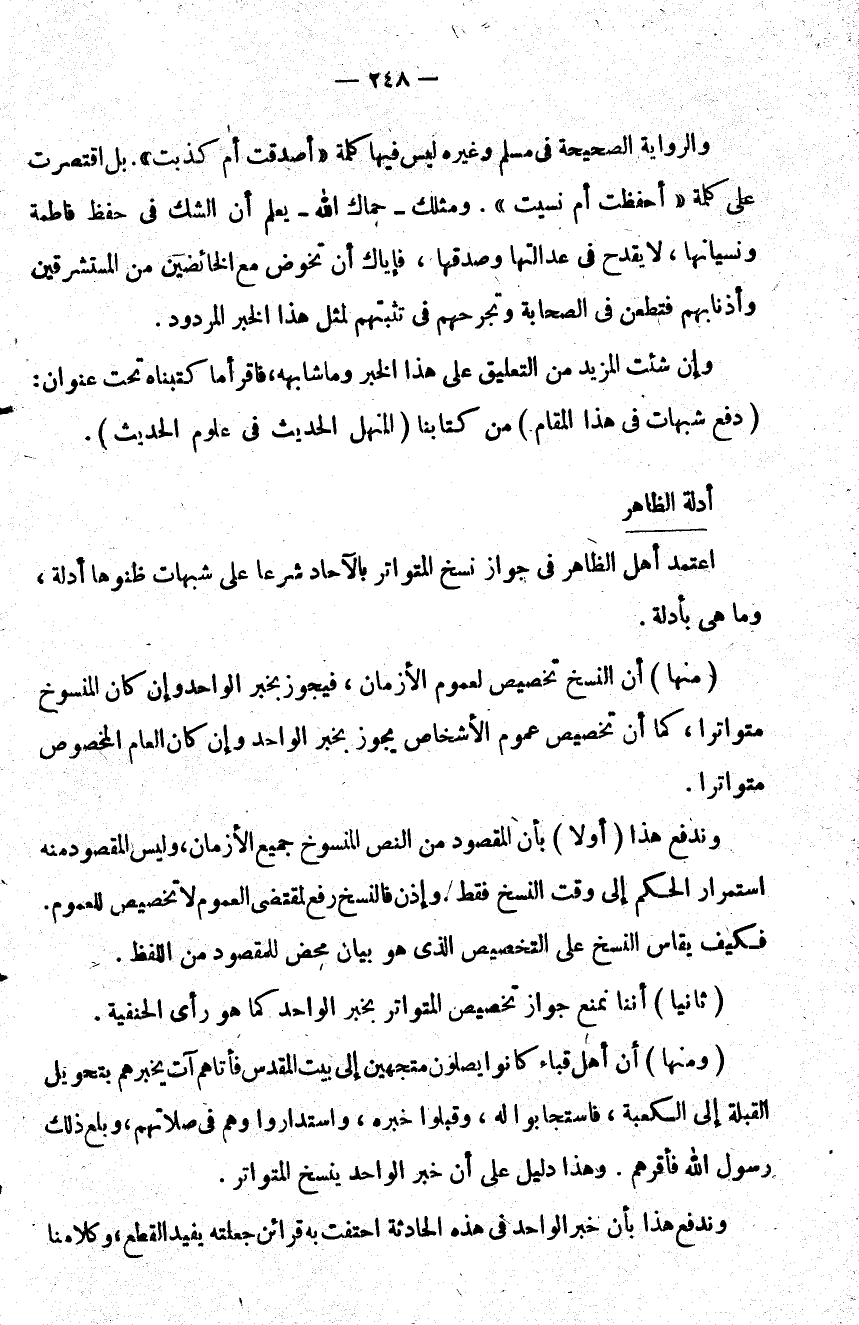 اعتمد أهل الظاهر في جواز نسخ المتواتر بالآحاد شرعا على شبهات ظنوها أدلة وما هي بأدلة.