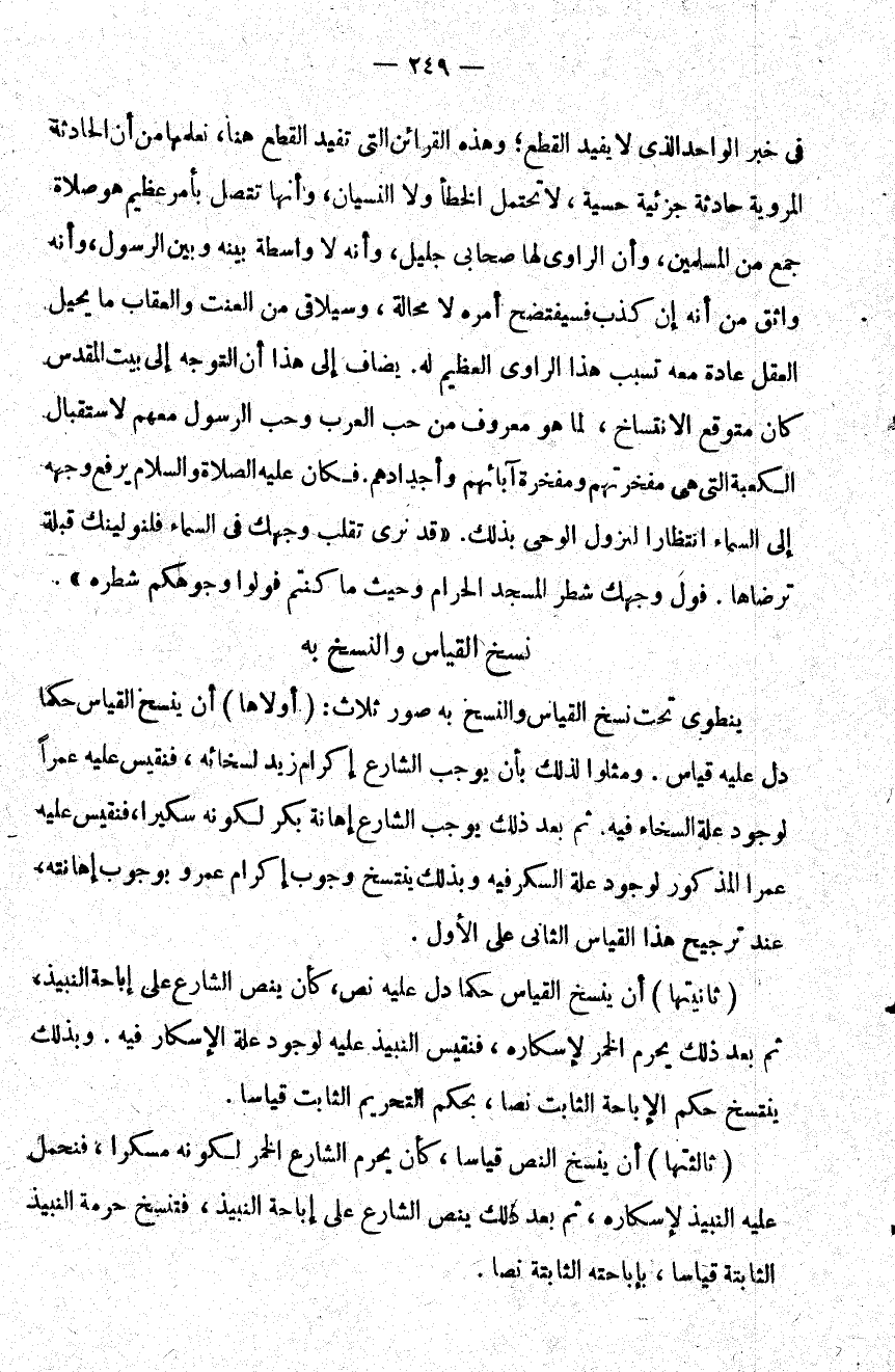 ثالثتها أن ينسخ النص قياسا كأن يحرم الشارع الخمر لكونه مسكرا فنحمل عليه النبيذ لإسكاره ثم بعد ذلك ينص الشارع على إباحة النبيذ فتنسخ حرمة النبيذ الثابتة قياسا بإباحته الثابتة نصا.
