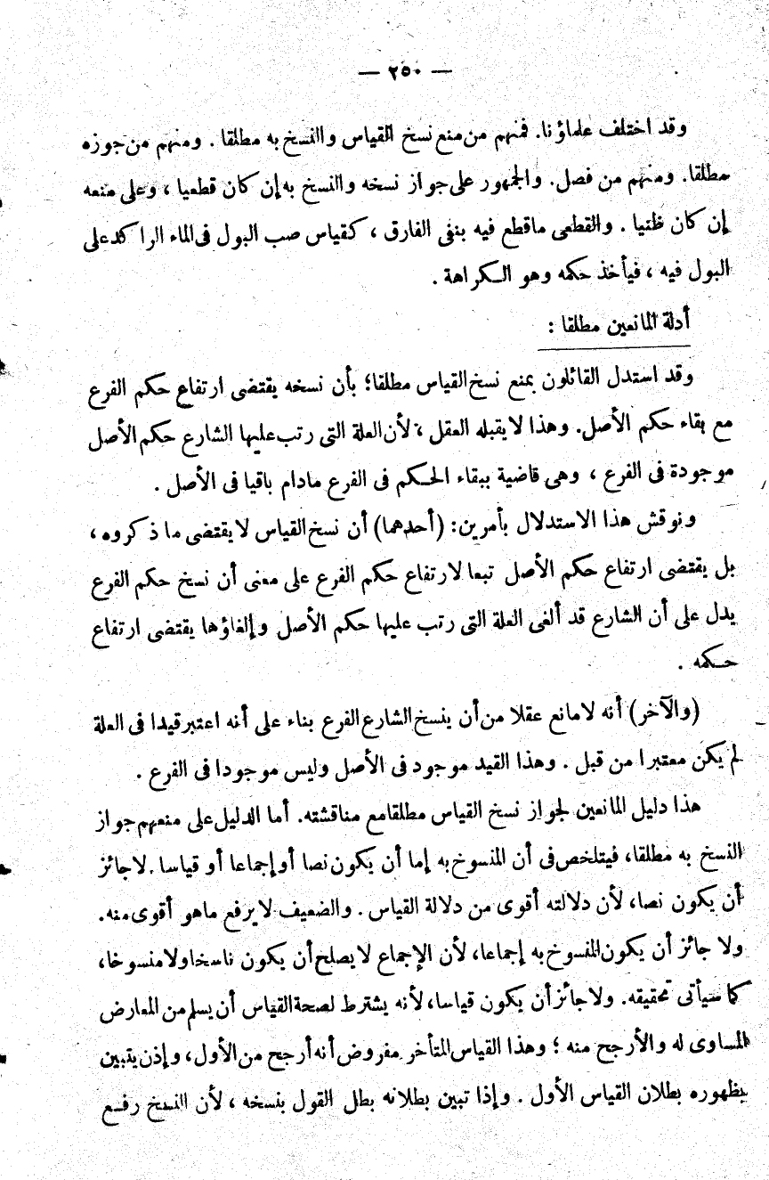 وقد استدل القائلون بمنع نسخ القياس مطلقا بأن نسخه يقتضي ارتفاع حكم الفرع مع بقاء حكم الأصل وهذا لا يقبله العقل لأن العلة التي رتب عليها الشارع حكم الأصل موجودة في الفرع وهي قاضية ببقاء الحكم في الفرع ما دام باقيا في الأصل.