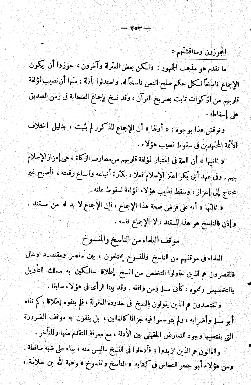 ما تقدم هو مذهب الجمهور ولكن بعض المعتزلة وآخرون جوزوا أن يكون الإجماع ناسخا لكل حكم صلح النص ناسخا له واستدلوا بأدلة منها أن نصيب المؤلفة قلوبهم من الزكوات ثابت بصريح القرآن وقد نسخ بإجماع الصحابة في زمن الصديق على إسقاطه.