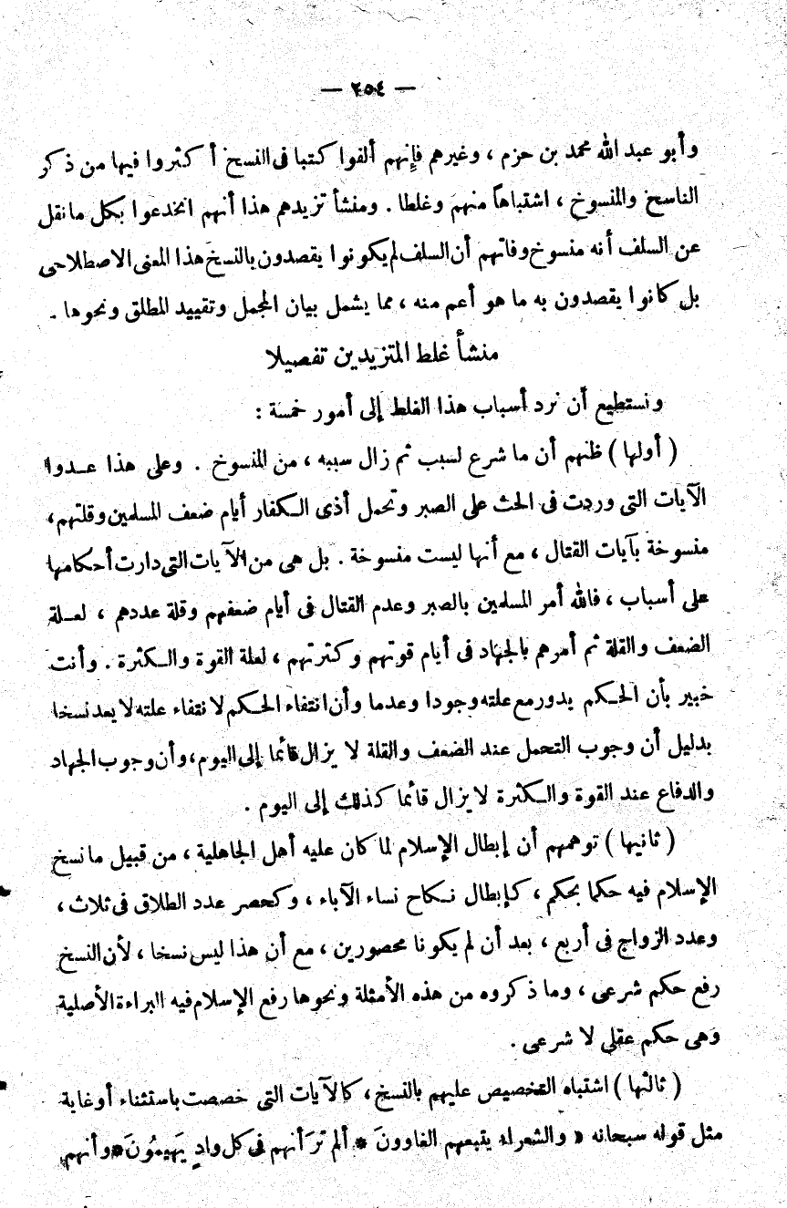 ثانيها توهمهم أن إبطال الإسلام لما كان عليه أهل الجاهلية من قبيل ما نسخ الإسلام فيه حكما بحكم كإبطال نكاح نساء الآباء وكحصر عدد الطلاق في ثلاث وعدد الزواج في أربع بعد أن لم يكونا محصورين مع أن هذا ليس نسخا لأن النسخ رفع حكم شرعي وما ذكروه من هذه الأمثلة ونحوها رفع الإسلام فيه البراءة الأصلية وهي حكم عقلي لا شرعي.