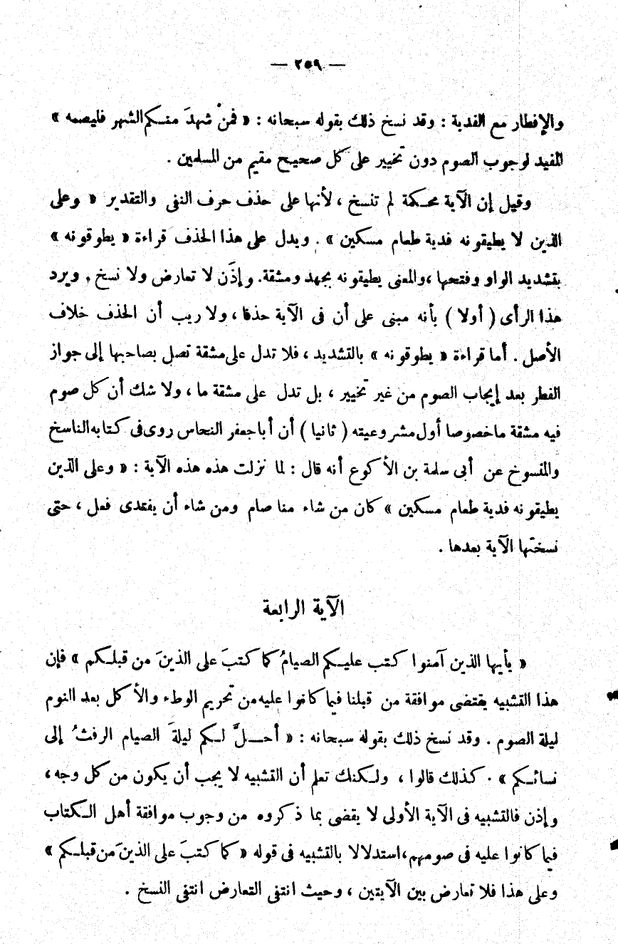 {يَا أَيُّهَا الَّذِينَ آمَنُوا كُتِبَ عَلَيْكُمُ الصِّيَامُ كَمَا كُتِبَ عَلَى الَّذِينَ مِنْ قَبْلِكُمْ} فإن هذا التشبيه يقتضي موافقة من قبلنا فيما كانوا عليه من تحريم الوطء والأكل بعد النوم ليلة الصوم وقد نسخ ذلك بقوله سبحانه: {أُحِلَّ لَكُمْ لَيْلَةَ الصِّيَامِ الرَّفَثُ إِلَى نِسَائِكُمْ} كذلك قالوا ولكنك تعلم أن التشبيه لا يجب أن يكون من كل وجه وإذن فالتشبيه في الآية الأولى لا يقضي بما ذكروه من وجوب موافقة أهل الكتاب فيما كانوا عليه في صومهم استدلالا بالتشبيه في قوله: {كَمَا كُتِبَ عَلَى الَّذِينَ مِنْ قَبْلِكُمْ} وعلى هذا فلا تعارض بين الآيتين وحيث انتفى التعارض انتفى النسخ.