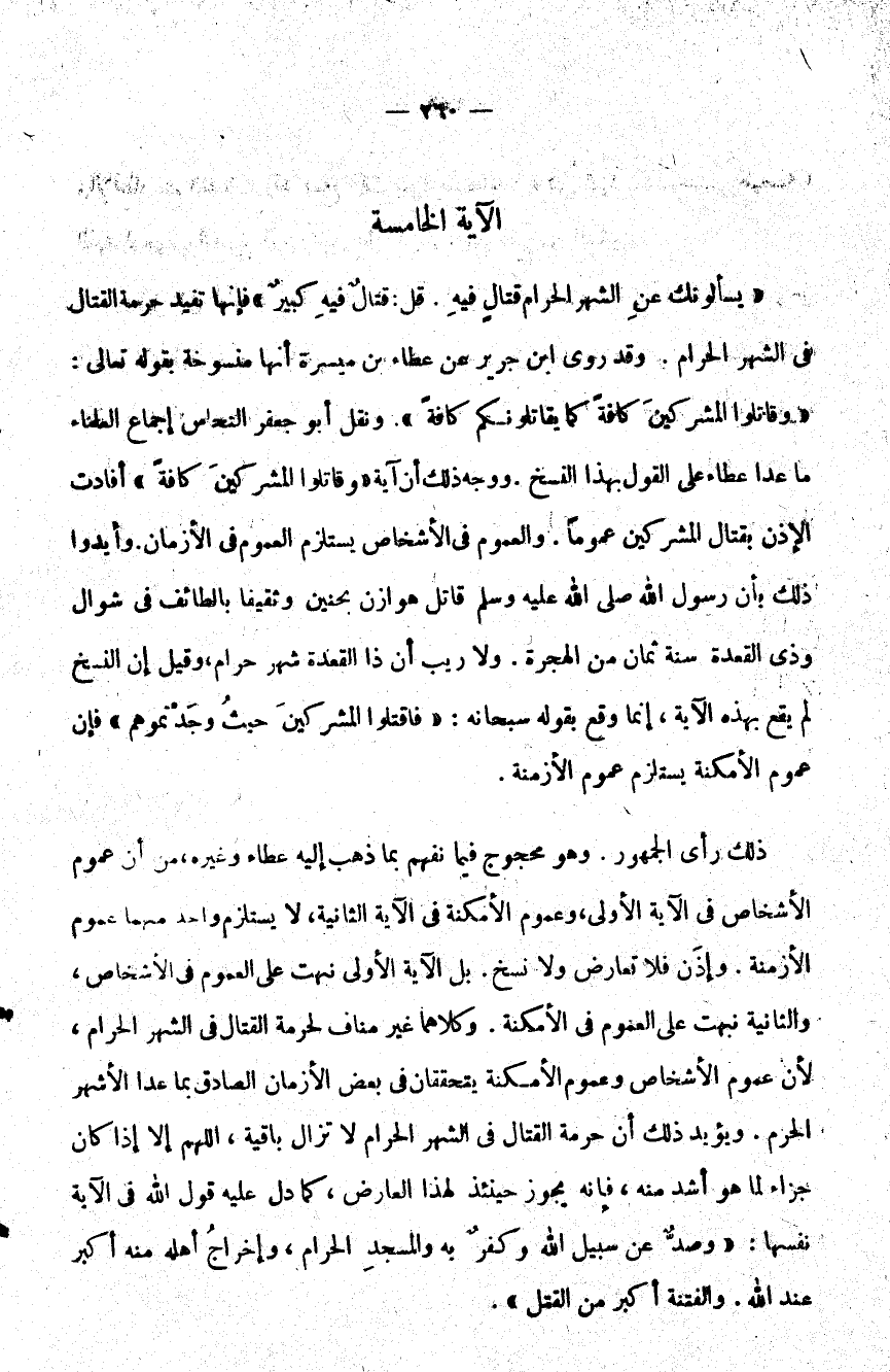 ذلك رأي الجمهور وهو محجوج فيما نفهم بما ذهب إليه عطاء وغيره من أن عموم الأشخاص في الآية الأولى وعموم الأمكنة في الآية الثانية ولا يستلزم واحد منهما عموم الأزمنة وإذن فلا تعارض ولا نسخ بل الآية الأولى نهت على العموم في الأشخاص والثانية نبهت على العموم في الأمكنة وكلاهما غير مناف لحرمة القتال في الشهر الحرام لأن عموم الأشخاص وعموم الأمكنة يتحققان في بعض الأزمان الصادق بما عدا الأشهر الحرم ويؤيد ذلك أن حرمة القتال في الشهر الحرام لا تزال باقية اللهم إلا إذا كان جزاء لما هو أشد منه فإنه يجوز حينئذ لهذا العارض كما دل عليه قول الله في الآية نفسها: {وَصَدٌّ عَنْ سَبِيلِ اللَّهِ وَكُفْرٌ بِهِ وَالْمَسْجِدِ الْحَرَامِ وَإِخْرَاجُ أَهْلِهِ مِنْهُ أَكْبَرُ عِنْدَ اللَّهِ وَالْفِتْنَةُ أَكْبَرُ مِنَ الْقَتْلِ} .